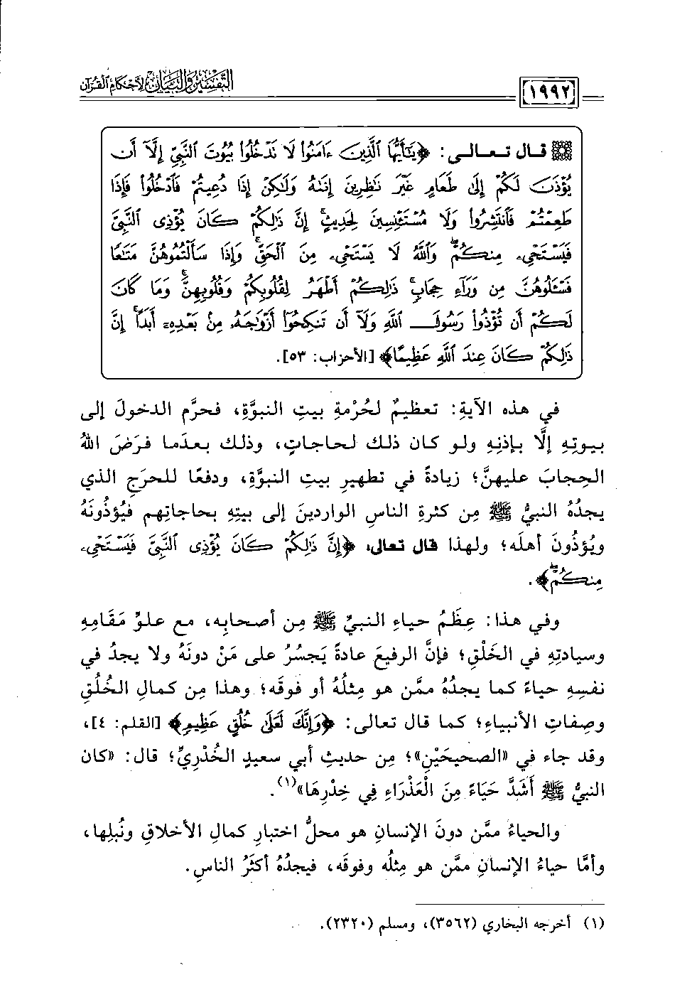 * قال تعالى: {يَاأَيُّهَا الَّذِينَ آمَنُوا لَا تَدْخُلُوا بُيُوتَ النَّبِيِّ إِلَّا أَنْ يُؤْذَنَ لَكُمْ إِلَى طَعَامٍ غَيْرَ نَاظِرِينَ إِنَاهُ وَلَكِنْ إِذَا دُعِيتُمْ فَادْخُلُوا فَإِذَا طَعِمْتُمْ فَانْتَشِرُوا وَلَا مُسْتَأْنِسِينَ لِحَدِيثٍ إِنَّ ذَلِكُمْ كَانَ يُؤْذِي النَّبِيَّ فَيَسْتَحْيِي مِنْكُمْ وَاللَّهُ لَا يَسْتَحْيِي مِنَ الْحَقِّ وَإِذَا سَأَلْتُمُوهُنَّ مَتَاعًا فَاسْأَلُوهُنَّ مِنْ وَرَاءِ حِجَابٍ ذَلِكُمْ أَطْهَرُ لِقُلُوبِكُمْ وَقُلُوبِهِنَّ وَمَا كَانَ لَكُمْ أَنْ تُؤْذُوا رَسُولَ اللَّهِ وَلَا أَنْ تَنْكِحُوا أَزْوَاجَهُ مِنْ بَعْدِهِ أَبَدًا إِنَّ ذَلِكُمْ كَانَ عِنْدَ اللَّهِ عَظِيمًا (٥٣)} [الأحزاب: ٥٣].