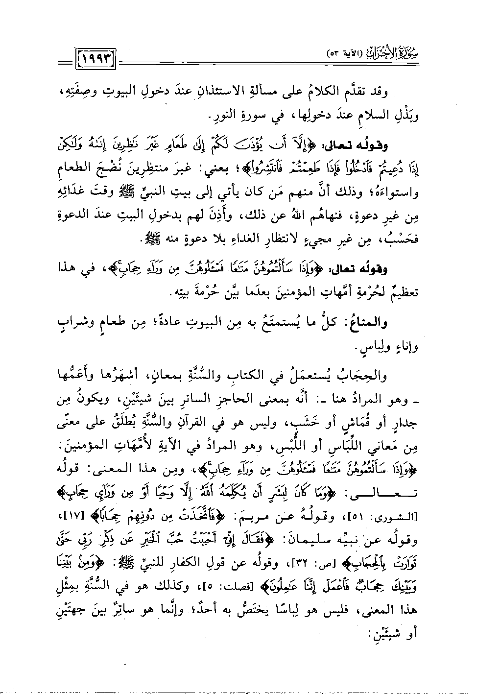 والحِجَابُ يُستعمَلُ في الكتَابِ والسُّنَّةِ بمعانٍ، أشهَرُها وأَعَمُّها -وهو المرادُ هنا-: أنَّه بمعنى الحاجزِ الساترِ بينَ شيئَيْنِ، ويكونُ مِن جدارٍ أو قُمَاشٍ أو خَشَبٍ، وليس هو في القرآنِ والسُّنَّةِ يُطلَقُ على معنًى مِن مَعاني اللِّبَاسِ أو اللّبْسِ، وهو المرادُ في الآيةِ لأُمَّهَاتِ المؤمنينَ: {وَإِذَا سَأَلْتُمُوهُنَّ مَتَاعًا فَاسْأَلُوهُنَّ مِنْ وَرَاءِ حِجَابٍ}، ومِن هذا المعنى: قولُه تعالى: {وَمَا كَانَ لِبَشَرٍ أَنْ يُكَلِّمَهُ اللَّهُ إِلَّا وَحْيًا أَوْ مِنْ وَرَاءِ حِجَابٍ} [الشورى: ٥١]، وقولُهُ عن مريمَ: {فَاتَّخَذَتْ مِنْ دُونِهِمْ حِجَابًا} [١٧]، وقولُه عن نبيِّه سليمانَ: {فَقَالَ إِنِّي أَحْبَبْتُ حُبَّ الْخَيْرِ عَنْ ذِكْرِ رَبِّي حَتَّى تَوَارَتْ بِالْحِجَابِ (٣٢)} [ص: ٣٢]، وقولُه عن قولِ الكفارِ للنبيِّ -صلى اللَّه عليه وسلم-: {وَمِنْ بَيْنِنَا وَبَيْنِكَ حِجَابٌ فَاعْمَلْ إِنَّنَا عَامِلُونَ (٥)} [فصلت: ٥]، وكذلك هو في السُّنَّةِ بمِثْلِ هذا المعنى، فليس هو لِباسًا يختَصُّ به أحدٌ؛ وإنَّما هو ساتِرٌ بينَ جهتَيْنِ أو شيئَيْنِ:
