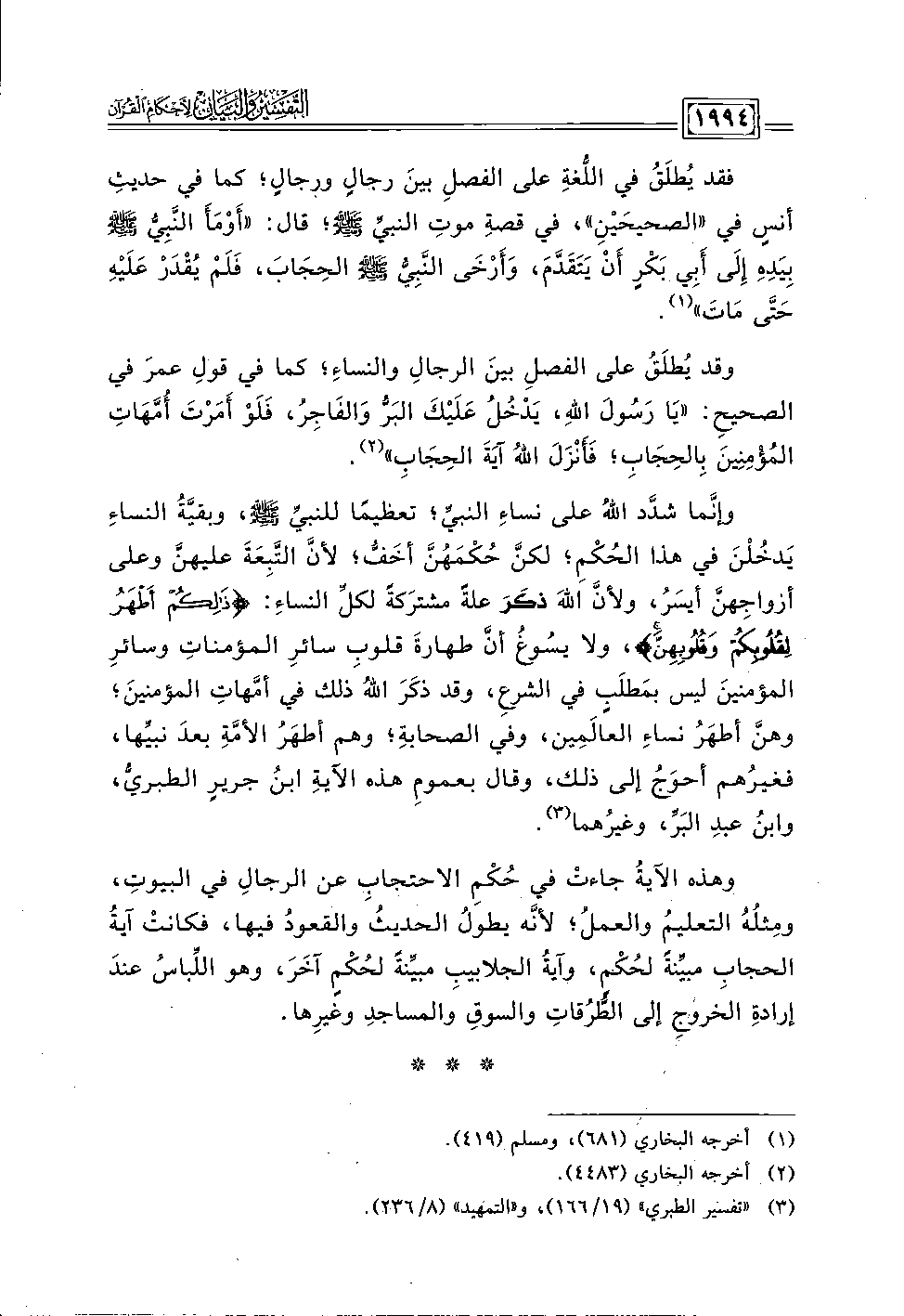 وقد يُطلَقُ على الفصلِ بينَ الرجالِ والنساءِ؛ كما في قولِ عمرَ في الصحيحِ: "يَا رَسُولَ اللَّهِ، يَدْخُلُ عَلَيْكَ البَرُّ وَالفَاجِرُ، فَلَوْ أَمَرْتَ أُمَّهَاتِ المُؤْمِنِينَ بِالحِجَابِ؛ فَأَنْزَلَ اللَّهُ آيَةَ الحِجَابِ" (٢).
