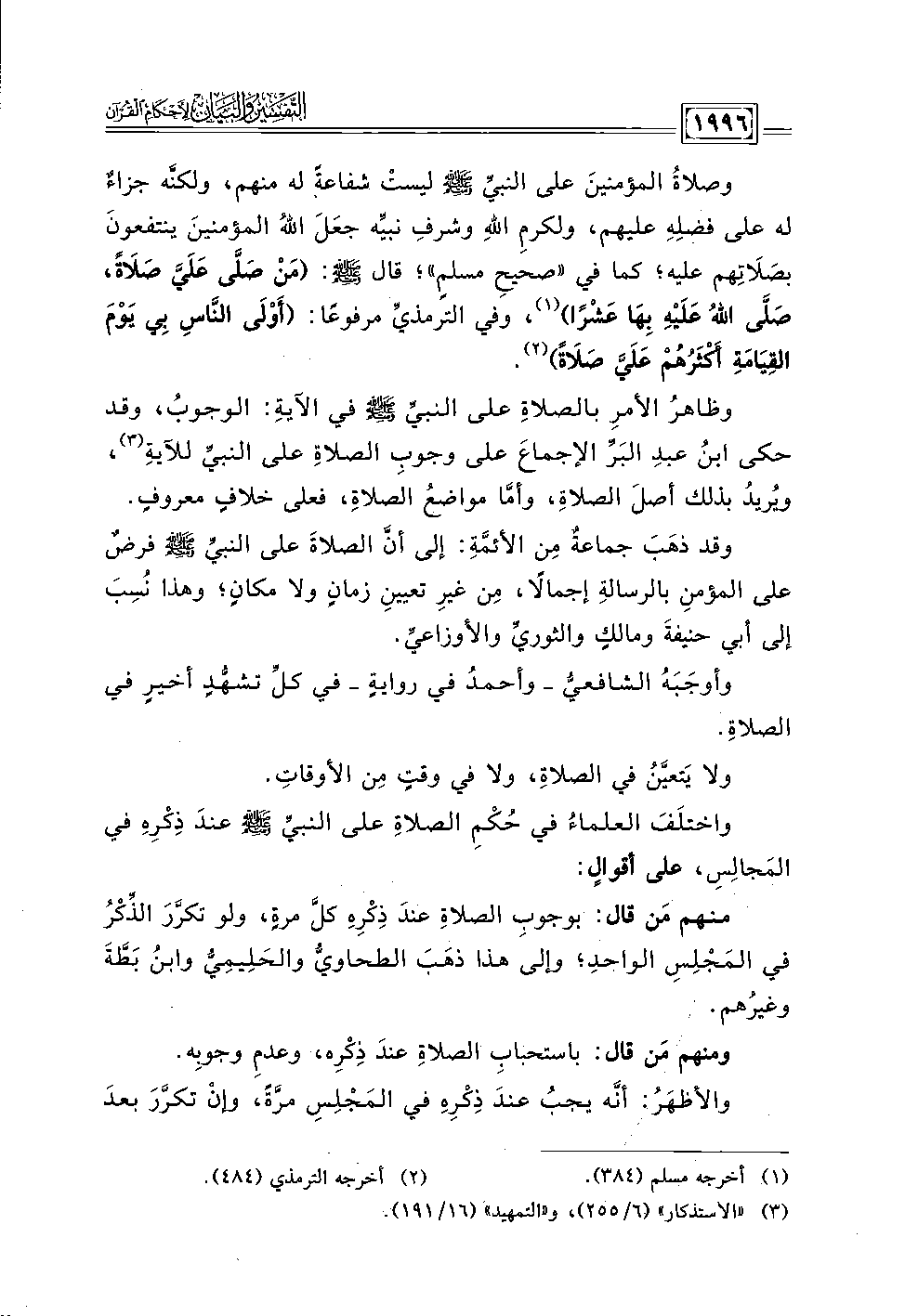وظاهرُ الأمرِ بالصلاةِ على النبيِّ -صلى اللَّه عليه وسلم- في الآيةِ: الوجوبُ، وقد حكى ابنُ عبدِ البَرِّ الإجماعَ على وجوبِ الصلاةِ على النبيِّ للآيةِ (٣)، ويُريدُ بذلك أصلَ الصلاةِ، وأمَّا مواضعُ الصلاةِ، فعلى خلافٍ معروفٍ.