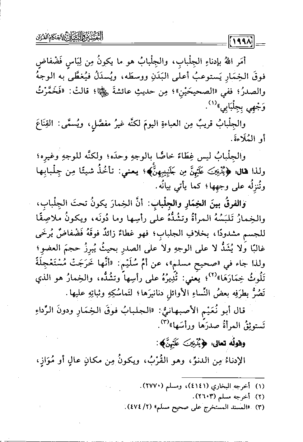 أمَر اللَّهُ بإدناءِ الجِلْبابِ، والجِلْبابُ هو ما يكونُ مِن لِبَاسٍ فَضْفاضٍ فوقَ الخِمَارِ يَستوعبُ أعلى البَدَنِ ووسطَه، ويُسدَلُ فيُغطَّى به الوجهُ والصدرُ؛ ففي "الصحيحَيْنِ"؛ مِن حديثِ عائشةَ -رضي اللَّه عنها-؛ قالتْ: "فَخَمَّرْتُ وَجْهي بِجِلبَابِي" (١).
