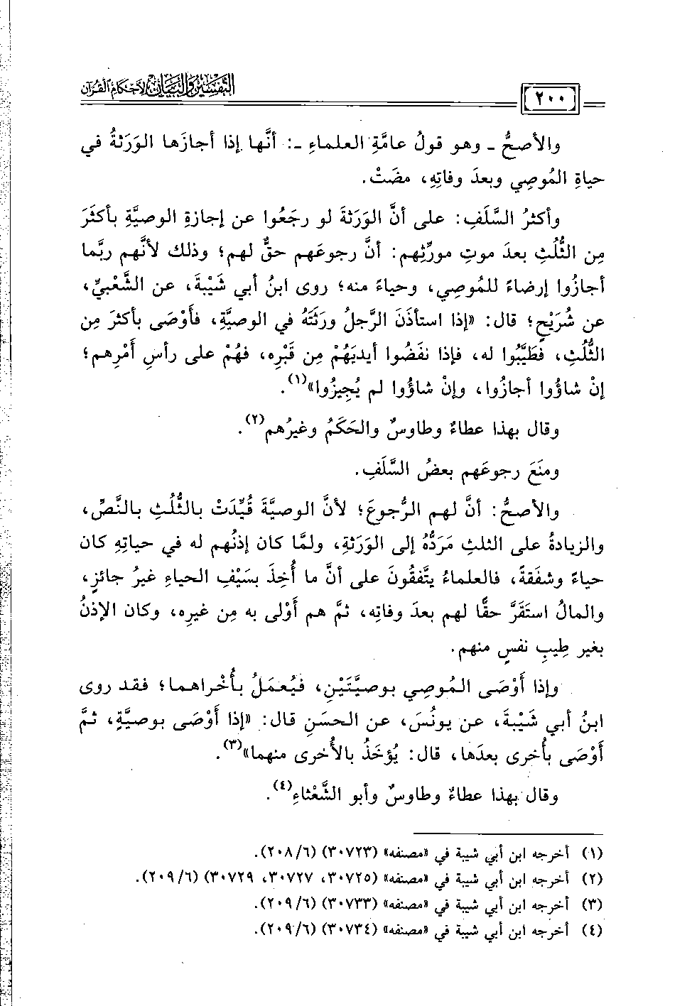 وأكثرُ السَّلَفِ: على أنَّ الوَرَثةَ لو رجَعُوا عن إجازةِ الوصيَّةِ بأكثَرَ مِن الثُّلُثِ بعدَ موتِ مورِّثِهم: أنَّ رجوعَهم حقٌّ لهم؛ وذلك لأنَّهم ربَّما أجازُوا إرضاءً للمُوصِي، وحياءً منه؛ روى ابنُ أبي شَيْبةَ، عن الشَّعْبيِّ، عن شُرَيْحٍ؛ قال: "إذا استأذَنَ الرَّجلُ ورَثَتَهُ في الوصيَّةِ، فأَوْصَى بأكثرَ مِن الثُّلُثِ، فطَيَّبُوا له، فإذا نفَضُوا أيديَهُمْ مِن قَبْرِه، فهُمْ على رأسِ أَمْرِهم؛ إنْ شاؤُوا أجازُوا، وإنْ شاؤُوا لم يُجِيزُوا" (١).