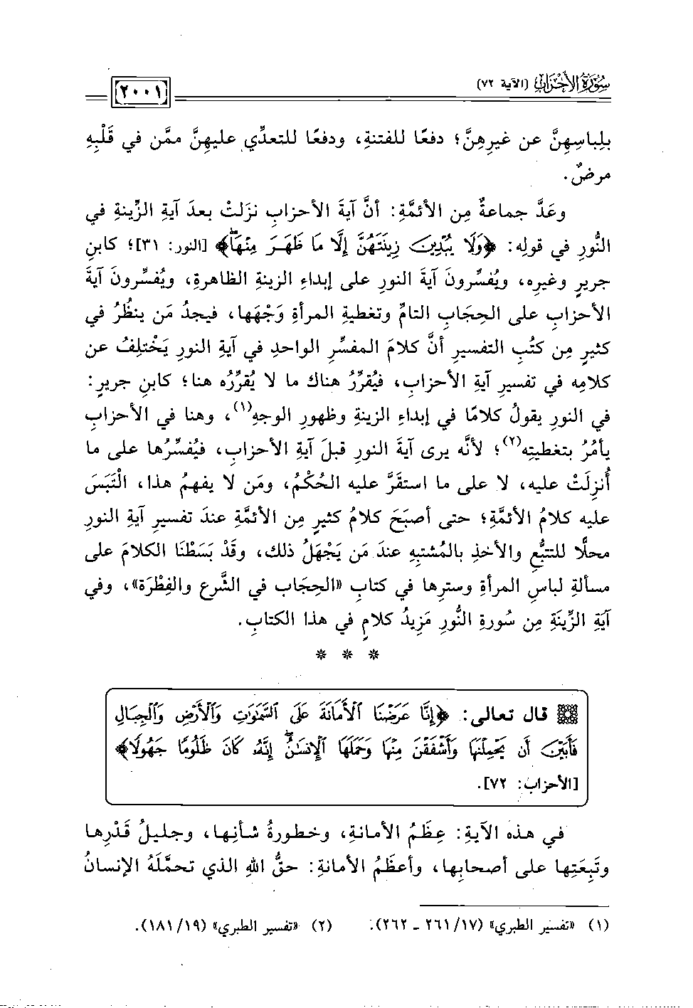 وعَدَّ جماعةٌ مِن الأئمَّةِ: أنَّ آيةَ الأحزابِ نزَلتْ بعدَ آيةِ الزِّينةِ في النُّورِ في قولِه: {وَلَا يُبْدِينَ زِينَتَهُنَّ إِلَّا مَا ظَهَرَ مِنْهَا} [النور: ٣١]؛ كابنِ جريرٍ وغيرِه؛ ويُفسِّرونَ آيةَ النورِ على إبداءِ الزينةِ الظاهرةِ، ويُفسِّرونَ آيةَ الأحزابِ على الحِجَابِ التامِّ وتغطيةِ المرأةِ وَجْهَها، فيجدُ مَن ينظُرُ في كثيرِ مِن كتُبِ التفسيرِ أنَّ كلامَ المفسِّرِ الواحدِ في آيةِ النورِ يَخْتلِفُ عن كلامِه في تفسيرِ آيةِ الأحزاب، فيُقرِّرُ هناك ما لا يُقررُه هنا؛ كابنِ جريرٍ: في النورِ يقولُ كلامًا في إبداءِ الزينةِ وظهورِ الوجهِ (١)، وهنا في الأحزابِ يأمُرُ بتغطيتِه (٢)؛ لأنَّه يرى آيةَ النورِ قبلَ آيةِ الأحزابِ، فيُفسِّرُها على ما أُنزِلَتْ عليه، لا على ما استقَرَّ عليه الحُكْمُ، ومَن لَا يفهمُ هذا، الْتَبَسَ عليه كلامُ الأئمَّةِ؛ حتى أصبَحَ كلامُ كثيرِ مِن الأئمَّةِ عندَ تفسيرِ وآيةِ النورِ محلَّا للتتبُّعِ والأخذِ بالمُشتبِهِ عندَ مَن يَجْهَلُ ذلك، وقَدْ بَسَطْنَا الكلامَ على مسألةِ لباسِ المرأةِ وسترِها في كتابِ "الحِجَاب في الشَّرع والفِطْرَة"، وفي آيَةِ الزِّيَنَةِ مِن سُورةِ النُّورِ مَزِيدُ كلامٍ في هذا الكتابِ.
