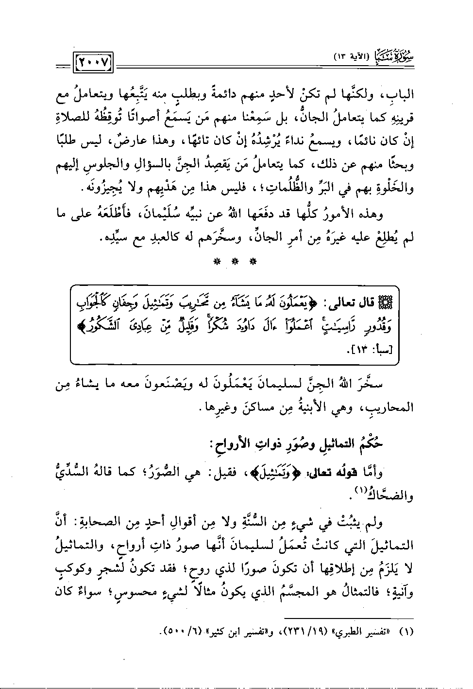 ولم يثبُتْ في شيءٍ مِن السُّنَّةِ ولا مِن أقوالِ أحدٍ مِن الصحابةِ: أنَّ التماثيلَ التي كانت تُعمَلُ لسليمانَ أنَّها صورُ ذاتِ أرواحٍ، والتماثيلُ لا يَلزَمُ من إطلاقِها أن تكونَ صورًا لذي روحٍ؛ فقد تكونُ لشجرٍ وكوكبٍ وآنيةٍ؛ فالتمثالُ هو المجسَّمُ الذي يكونُ مثالًا لشيءٍ محسوسٍ؛ سواءٌ كان