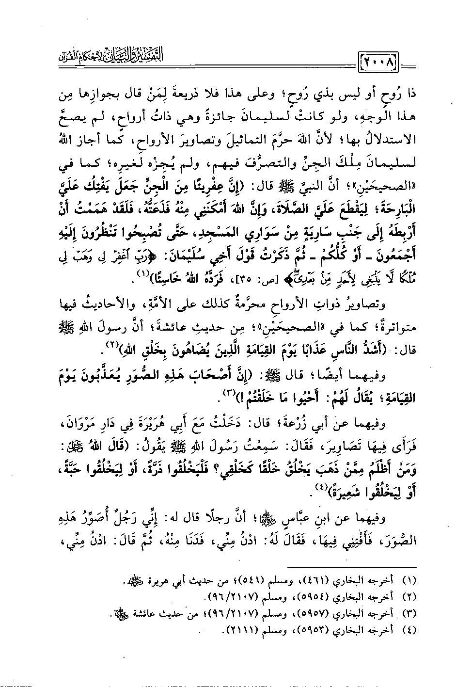 وتصاويرُ ذواتِ الأرواحِ محرَّمةٌ كذلك على الأمَّةِ، والأحاديثُ فيها متواترةٌ؛ كما في "الصحيحَيْنِ"؛ مِن حديثِ عائشةَ؛ أنَّ رسولَ اللَّهِ -صلى اللَّه عليه وسلم- قال: (أَشَدُّ النَّاسِ عَذَابًا يَوْمَ القِيَامَةِ الَّذِينَ يُضَاهُونَ بِخَلْقِ اللَّهِ) (٢).