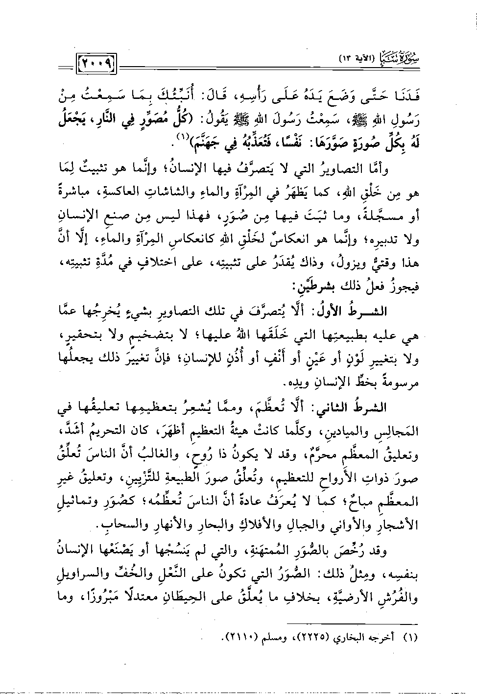 وأمَّا التصاويرُ التي لا يَتصرَّفُ فيها الإنسانُ؛ وَإِنَّمَا هُوَ تَثْبِيتٌ لِمَا هو مِن خَلْقِ اللَّهِ، كَمَا يَظهَرُ فِي المِرْآةِ وَالمَاءِ والشاشاتِ العاكسةِ، مباشرةً أو مسجَّلةً، وما ثبَتَ فِيهَا مِنْ صُوَرٍ، فهذا ليس مِنْ صنعِ الإنسانِ ولا تدبيرِه؛ وإنَّما هو انعكاسٌ لخَلْقِ اللَّهِ كانعكاسِ المِرْآةِ وَالماءِ، إلَّا أنَّ هذا وقتيٌّ ويزُولُ، وذاك يُقدَرُ على تثبيتِه، عَلَى اختلافٍ فِي مُدَّةِ تثبيتِه، فيجوزُ فعلُ ذلك بشرطَيْنِ: