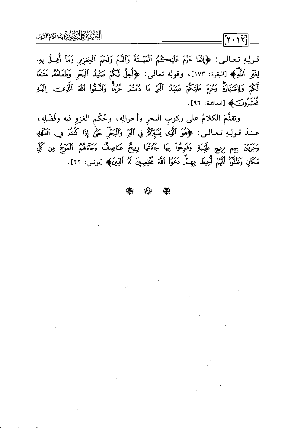 قولِهِ تعالى: {إِنَّمَا حَرَّمَ عَلَيْكُمُ الْمَيْتَةَ وَالدَّمَ وَلَحْمَ الْخِنْزِيرِ وَمَا أُهِلَّ بِهِ لِغَيْرِ اللَّهِ} [البقرة: ١٧٣]، وقولِه تعالى: {أُحِلَّ لَكُمْ صَيْدُ الْبَحْرِ وَطَعَامُهُ مَتَاعًا لَكُمْ وَلِلسَّيَّارَةِ وَحُرِّمَ عَلَيْكُمْ صَيْدُ الْبَرِّ مَا دُمْتُمْ حُرُمًا وَاتَّقُوا اللَّهَ الَّذِي إِلَيْهِ تُحْشَرُونَ} [المائدة: ٩٦].