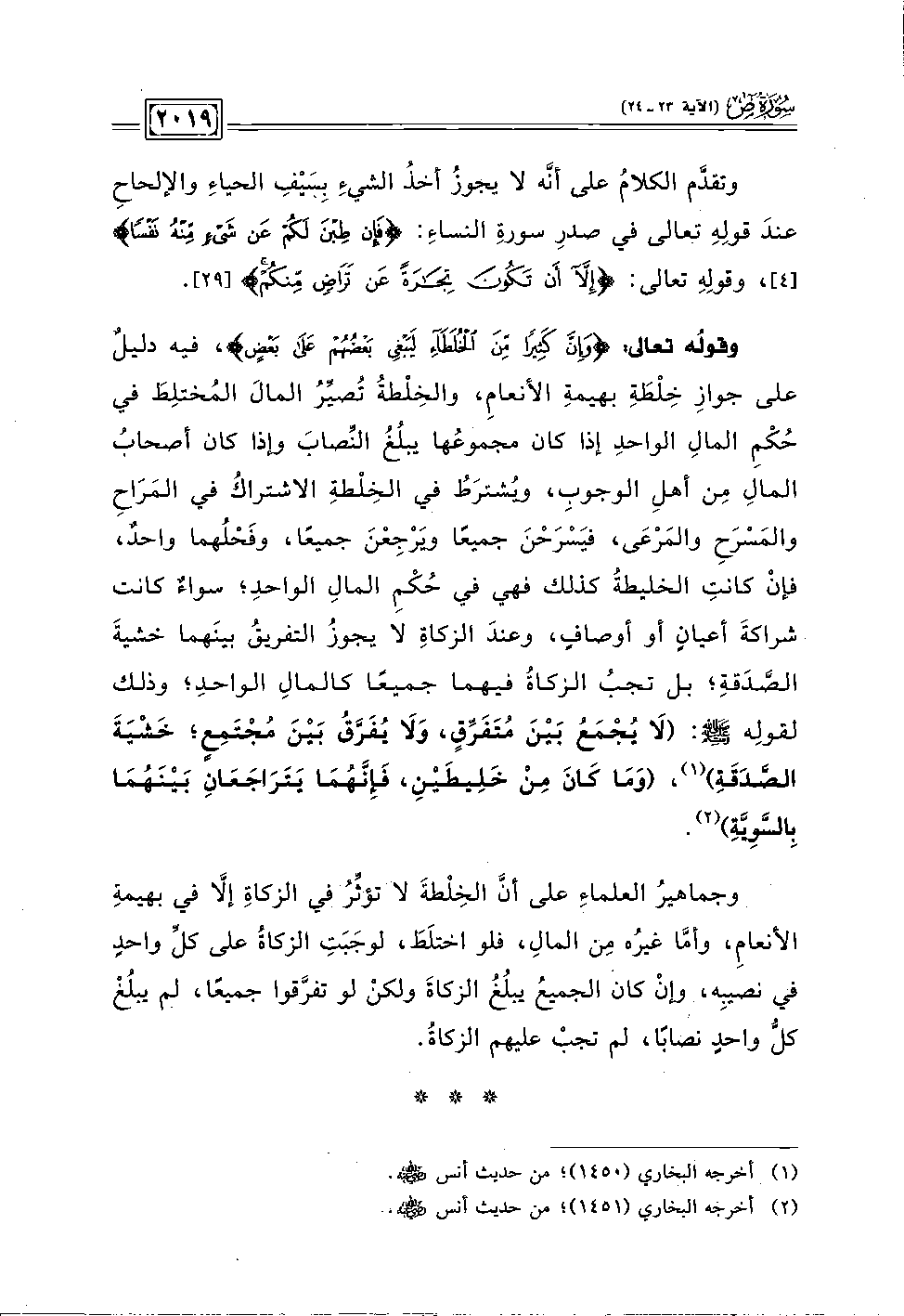 وقولُه تعالى: {وَإِنَّ كَثِيرًا مِنَ الْخُلَطَاءِ لَيَبْغِي بَعْضُهُمْ عَلَى بَعْضٍ}، فيه دليلٌ على جوازِ خِلْطَةِ بهيمةِ الأنعام، والخِلْطةُ تُصيِّرُ المالَ المُختلِطَ في حُكْمِ المالِ الواحدِ إذا كان مجموعُها يبلُغُ النِّصابَ وإذا كان أصحابُ المالِ مِن أهلِ الوجوبِ، ويُشترَطُ في الخِلْطةِ الاشتراكُ في المَرَاحِ والمَسْرَحِ والمَرْعَى، فيَسْرَحْنَ جميعًا ويَرْجِعْنَ جميعًا، وفَحْلُهما واحدٌ، فإنْ كانتِ الخليطةُ كذلك فهي في حُكْمِ المالِ الواحدِ؛ سواءٌ كانت شراكةَ أعيانٍ أو أوصافٍ، وعندَ الزكاةِ لا يجوزُ التفريقُ بينَهما خشيةَ الصَّدَقةِ؛ بل تجبُ الزكاةُ فيهما جميعًا كالمالِ الواحدِ؛ وذلك لقولِه -صلى اللَّه عليه وسلم-: (لَا يُجْمَعُ بَيْنَ مُتَفَرِّقٍ، وَلَا يُفَرَّق بَيْنَ مُجْتَمِعٍ؛ خَشْيَةَ الصَّدَقَةِ) (١)، (وَمَا كَانَ مِنْ خَلِيطَيْن، فَإِنَّهُمَا يَتَرَاجَعَانِ بَيْنَهُمَا بِالسَّوِيَّةِ) (٢).