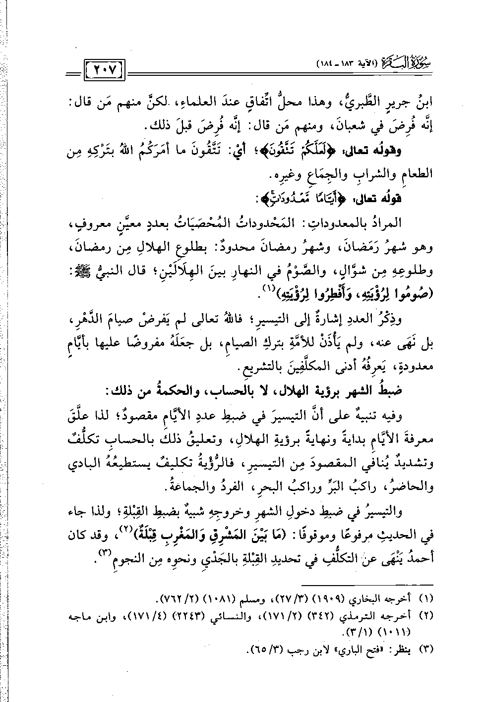 والتيسيرُ في ضبطِ دخولِ الشهرِ وخروجِهِ شبيهٌ بضبطِ القِبْلةِ؛ ولذا جاء في الحديثِ مرفوعًا وموقوفًا: (مَا بَيْنَ المَشْرِقِ وَالمَغْرِبِ قِبْلَةٌ) (٢)، وقد كان أحمدُ يَنْهَى عن التكلُّفِ في تحديدِ القِبْلةِ بالجَدْيِ ونحوِه مِن النجومِ (٣).