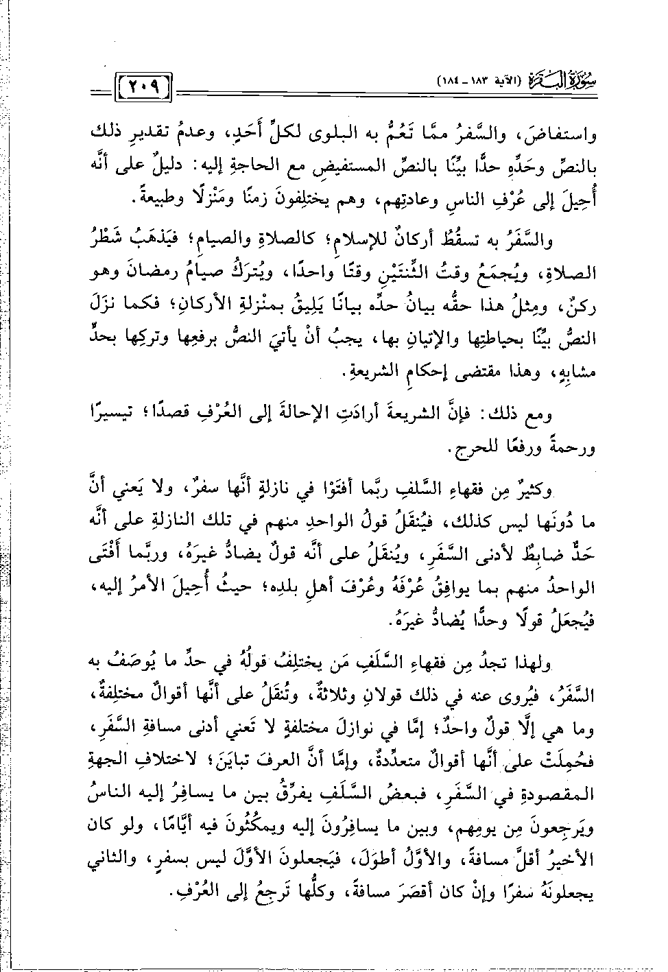 واستفاضَ، والسَّفرُ ممَّا تَعُمُّ به البلوى لكلِّ أَحَدٍ، وعدمُ تقديرِ ذلك بالنصِّ وحَدِّهِ حدًّا بيِّنًا بالنصِّ المستفيضِ مع الحاجةِ إليه: دليلٌ على أنَّه أُحِيلَ إلى عُرْفِ الناسِ وعادتِهم، وهم يختلِفونَ زمنًا ومَنْزلًا وطبيعةً.
