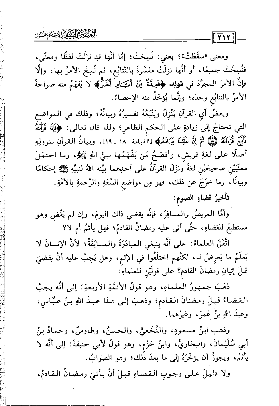 وبعضُ آيِ القرآنِ يَنْزِلُ ويَتْبَعُهُ تفسيرُهُ وبيانُهُ؛ وذلك في المواضعِ التي تحتاجُ إلى زيادةٍ على الحكمِ الظاهرِ؛ ولذا قال تعالى: {فَإِذَا قَرَأْنَاهُ فَاتَّبِعْ قُرْآنَهُ (١٨) ثُمَّ إِنَّ عَلَيْنَا بَيَانَهُ} [القيامة: ١٨, ١٩]، وبيانُ القرآنِ بنزولِهِ أصلًا على لغةِ قريشٍ، وأفصَحُ مَن يَفْهَمُها نبيُّ اللهِ - صلى الله عليه وسلم -، وما احتمَلَ معنَيَيْنِ صحيحَيْنِ لغةً ونزَلَ القرآنُ على أحدِهما بيَّنه اللهُ لنبيِّهِ - صلى الله عليه وسلم - إحكامًا وبيانًا، وما خَرَجَ عن ذلك، فهو مِن مواضعِ السَّعَةِ والرَّحمةِ بالأمَّةِ.