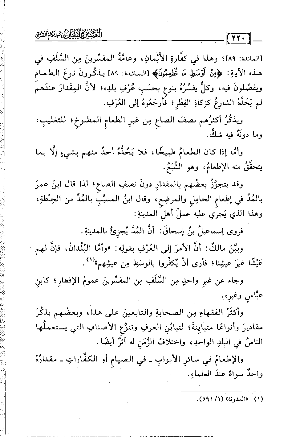 [المائدة: ٨٩]؛ وهذا في كفَّارةِ الأَيْمانِ، وعامَّةُ المفسِّرينَ مِن السَّلَفِ في هذه الآيةِ: {مِنْ أَوْسَطِ مَا تُطْعِمُونَ} [المائدة: ٨٩] يذكُرونَ نوعَ الطعامِ ويفصِّلونَ فيه، وكلٌّ يفسِّرُهُ بنوعٍ بحسَبِ عُرْفِ بلدِه؛ لأنَّ المِقْدارَ عندَهم لم يَحُدَّهُ الشارعُ كزكاةِ الفِطْرِ؛ فأرجَعُوهُ إلى العُرْفِ.