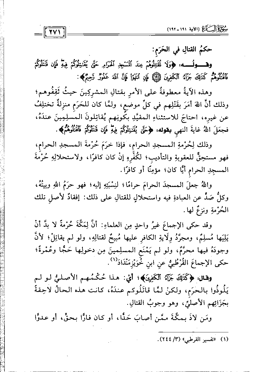 وهذه الآيةُ معطوفةٌ على الأمرِ بقتالِ المشرِكِينَ حيثُ ثَقِفُوهم؛ وذلك أنَّ اللهَ أمَرَ بقَتْلِهم في كلِّ موضعٍ، ولمَّا كان للحَرَمِ منزِلةٌ تختلِفُ عن غيرِه، احتاجَ للاستثناءِ المقيَّدِ بكونِهم يُقاتِلونَ المسلِمينَ عندَهُ، فجعَلَ اللهُ غايةَ النهيِ بقوله: {حَتَّى يُقَاتِلُوكُمْ فِيهِ فَإِنْ قَاتَلُوكُمْ فَاقْتُلُوهُمْ}.