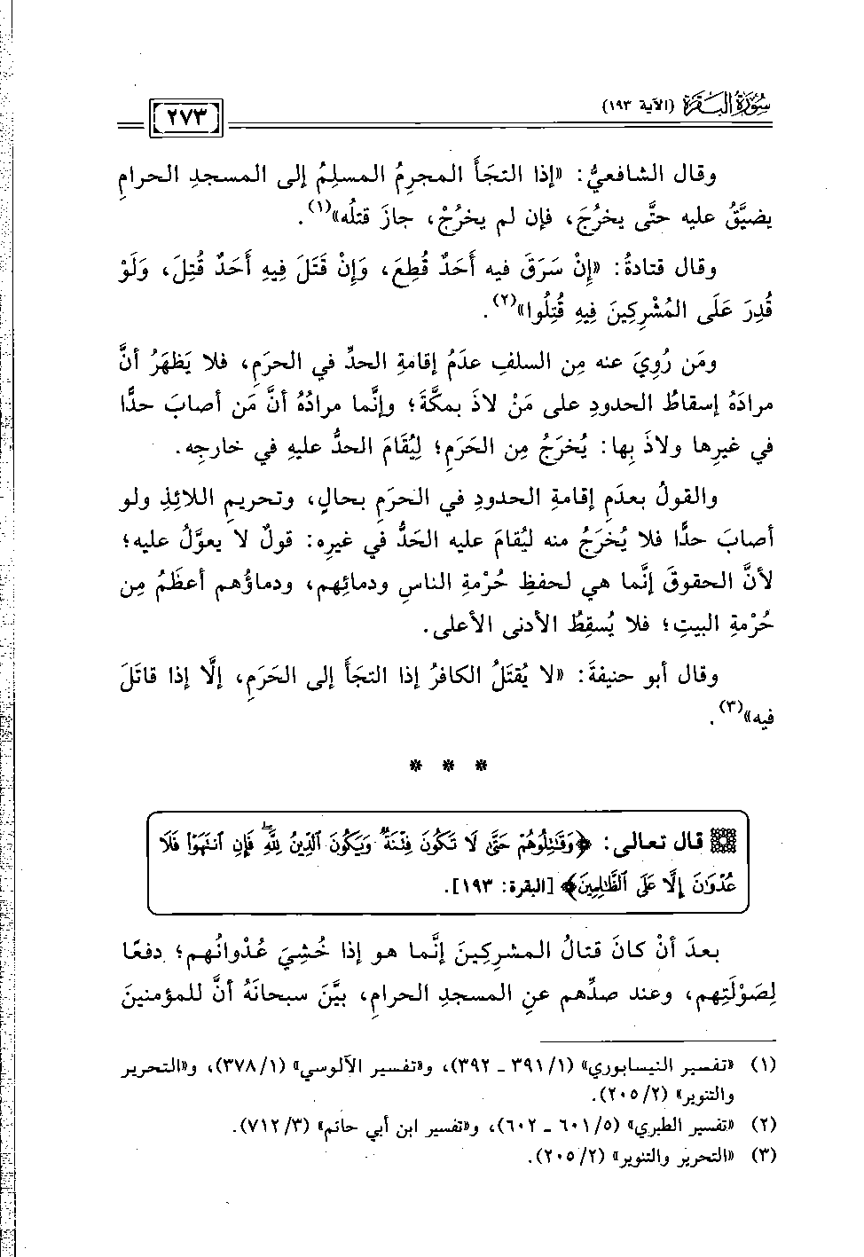 وقال قتادةُ: "إِنْ سَرَقَ فيه أَحَدٌ قُطِعَ، وَإِنْ قَتَلَ فِيهِ أَحَدٌ قُتِلَ، وَلَوْ قُدِرَ عَلَى المُشْرِكِينَ فِيهِ قُتِلُوا" (٢).