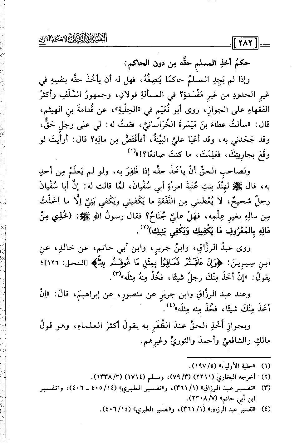 وإذا لم يَجِدِ المسلمُ حاكمًا يُنصِفُهُ، فهل له أن يأخُذ حقَّه بنفسِهِ في غيرِ الحدودِ من غيرِ مَفْسَدةٍ؟ في المسألةِ قولانِ، وجمهورُ السَّلَفِ وأكثرُ الفقهاءِ على الجوازِ، روى أبو نُعَيْمٍ في "الحِلْيةِ"، عن قُدامةَ بنِ الهيثمِ، قال: "سألتُ عطاءَ بنَ مَيْسَرةَ الخُرَاسانيَّ، فقلتُ له: لي على رجلٍ حَقٌّ، وقد جَحَدني به، وقد أعْيَا عليَّ البيِّنةُ، أفأَقْتَصُّ مِن مالِهِ؟ قال: أرأيتَ لو وقَعَ بجارِيتِكَ، فعَلِمْتَ، ما كنتَ صانعًا؟ ! " (١)