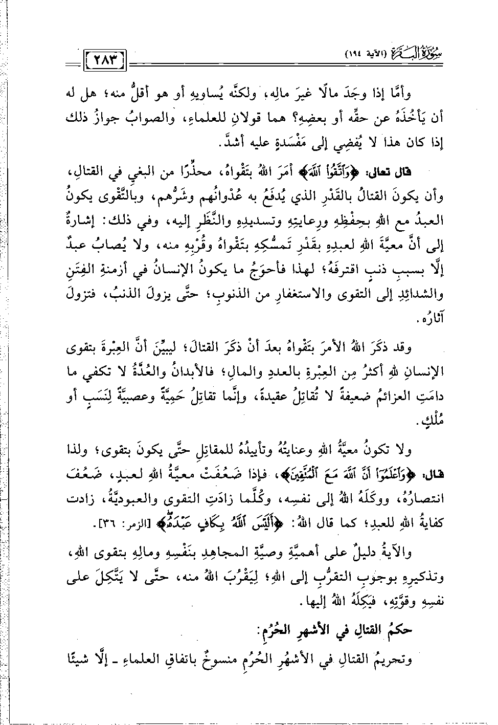 ولا تكونُ معيَّةُ اللهِ وعنايتُهُ وتأبيدُهُ للمقاتِلِ حتَّى يكونَ بتقوى؛ ولذا قال: {وَاعْلَمُوا أَنَّ اللَّهَ مَعَ الْمُتَّقِينَ}، فإذا ضَعُفَتْ معيَّةُ اللهِ لعبدٍ، ضَعُفَ انتصارُهُ، ووكَلَهُ اللهُ إلى نفسِه، وكُلَّما زادَتِ التقوى والعبوديَّةُ، زادت كفايةُ اللهِ للعبدِ؛ كما قال اللهُ: {أَلَيْسَ اللَّهُ بِكَافٍ عَبْدَهُ} [الزمر: ٣٦].