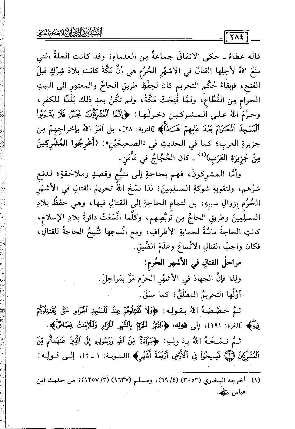 وأمَّا المشرِكونَ، فهم بحاجةٍ إلى تتبُّعٍ وقصدٍ وملاحَقةٍ؛ لدفعِ شرِّهم، ولتقويةِ شوكةِ المسلِمِينَ؛ لذا نسَخَ اللهُ تحريمَ القتالِ في الأشهُرِ الحُرُمِ بِزوالِ سببِهِ، بل لتمامِ الحاجةِ إلى القتالِ فيها، وهي حفظُ بلادِ المسلِمِينَ وطريقِ الحاجِّ مِن تربُّصِهم، وكلَّما اتَّسَعَتْ دائرةُ بلادِ الإسلامِ، كانتِ الحاجةُ ماسَّةً لحمايةِ الأطرافِ، ومع اتِّساعِها تتَّسِعُ الحاجةُ للقتالِ، فكان واجبُ القتالِ الاتِّساعَ وعدَمَ الضِّيقِ.
