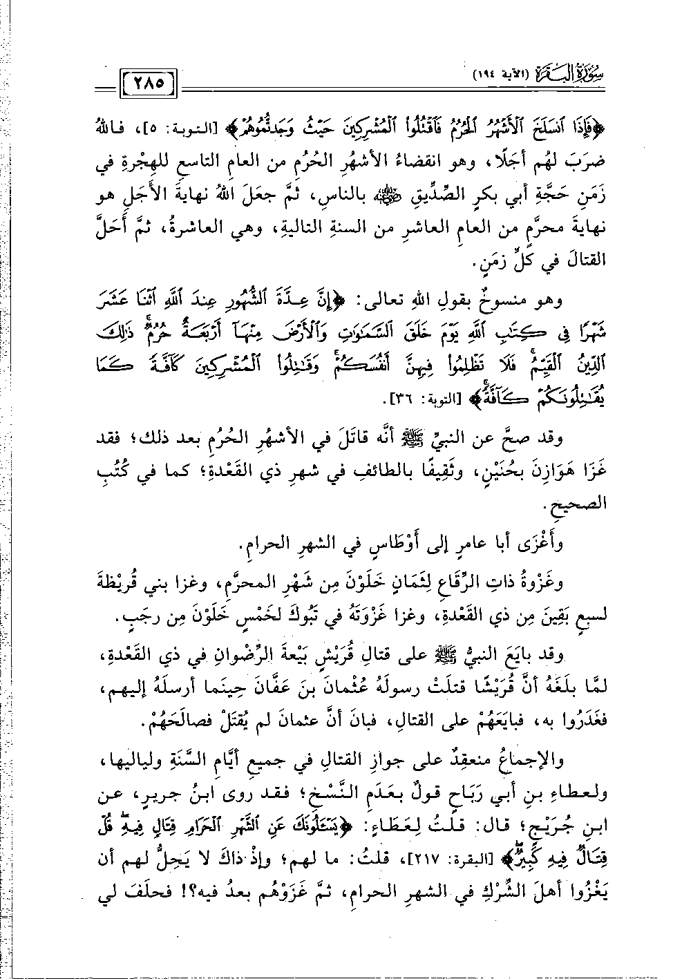 والإجماعُ منعقِدٌ على جوازِ القتالِ في جميعِ أيَّامِ السَّنَةِ ولياليها، ولعطاءِ بنِ أبي رَبَاحٍ قولٌ بعَدَمِ النَّسْخِ؛ فقد روى ابنُ جريرٍ، عن ابنِ جُرَيْجٍ؛ قال: قلتُ لِعَطَاءٍ: {يَسْأَلُونَكَ عَنِ الشَّهْرِ الْحَرَامِ قِتَالٍ فِيهِ قُلْ قِتَالٌ فِيهِ كَبِيرٌ} [البقرة: ٢١٧]، قلتُ: ما لهم؛ وإذْ ذاكَ لا يَحِلُّ لهم أن يَغزُوا أهلَ الشِّرْكِ في الشهرِ الحرامِ، ثمَّ غَزَوْهُم بعدُ فيه؟ ! فحلَفَ لي