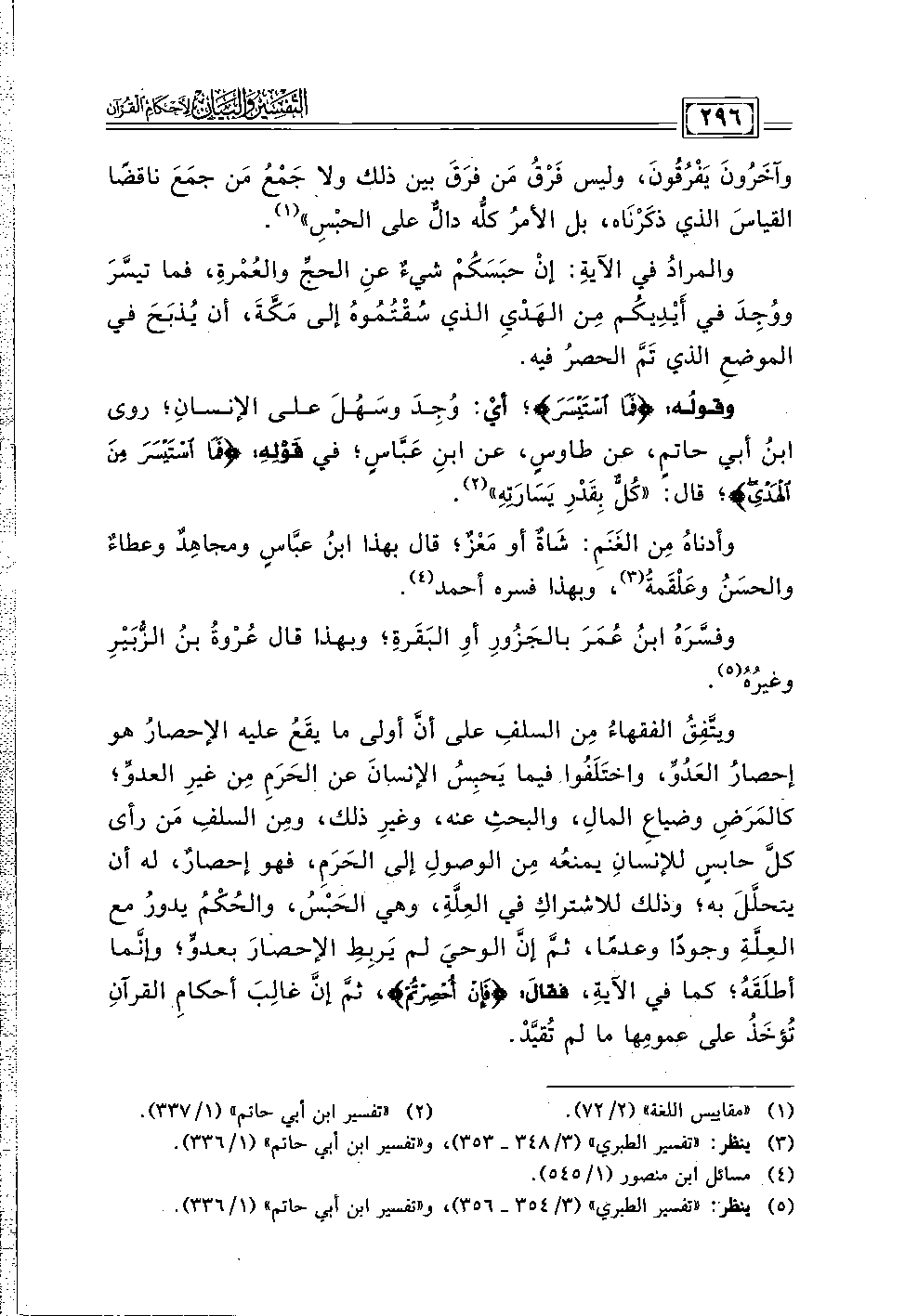 ويتَّفِقُ الفقهاءُ مِن السلفِ على أنَّ أولى ما يقَعُ عليه الإحصارُ هو إحصارُ العَدُوِّ، واختَلَفُوا فيما يَحبِسُ الإنسانَ عن الحَرَمِ مِن غيرِ العدوِّ؛ كالمَرَضِ وضياعِ المالِ، والبحثِ عنه، وغيرِ ذلك، ومِن السلفِ مَن رأى كلَّ حابسٍ للإنسانِ يمنعُه مِن الوصولِ إلى الحَرَمِ، فهو إحصارٌ، له أن يتحلَّلَ به؛ وذلك للاشتراكِ في العِلَّةِ، وهي الحَبْسُ، والحُكْمُ يدورُ مع العِلَّةِ وجودًا وعدمًا، ثمَّ إنَّ الوحيَ لم يَربِطِ الإحصارَ بعدوٍّ؛ وإنَّما أطلَقَهُ؛ كما في الآيةِ، فقالَ: {فَإِنْ أُحْصِرْتُمْ}، ثمَّ إنَّ غالِبَ أحكامِ القرآنِ تُؤخَذُ على عمومِها ما لم تُقيَّدْ.