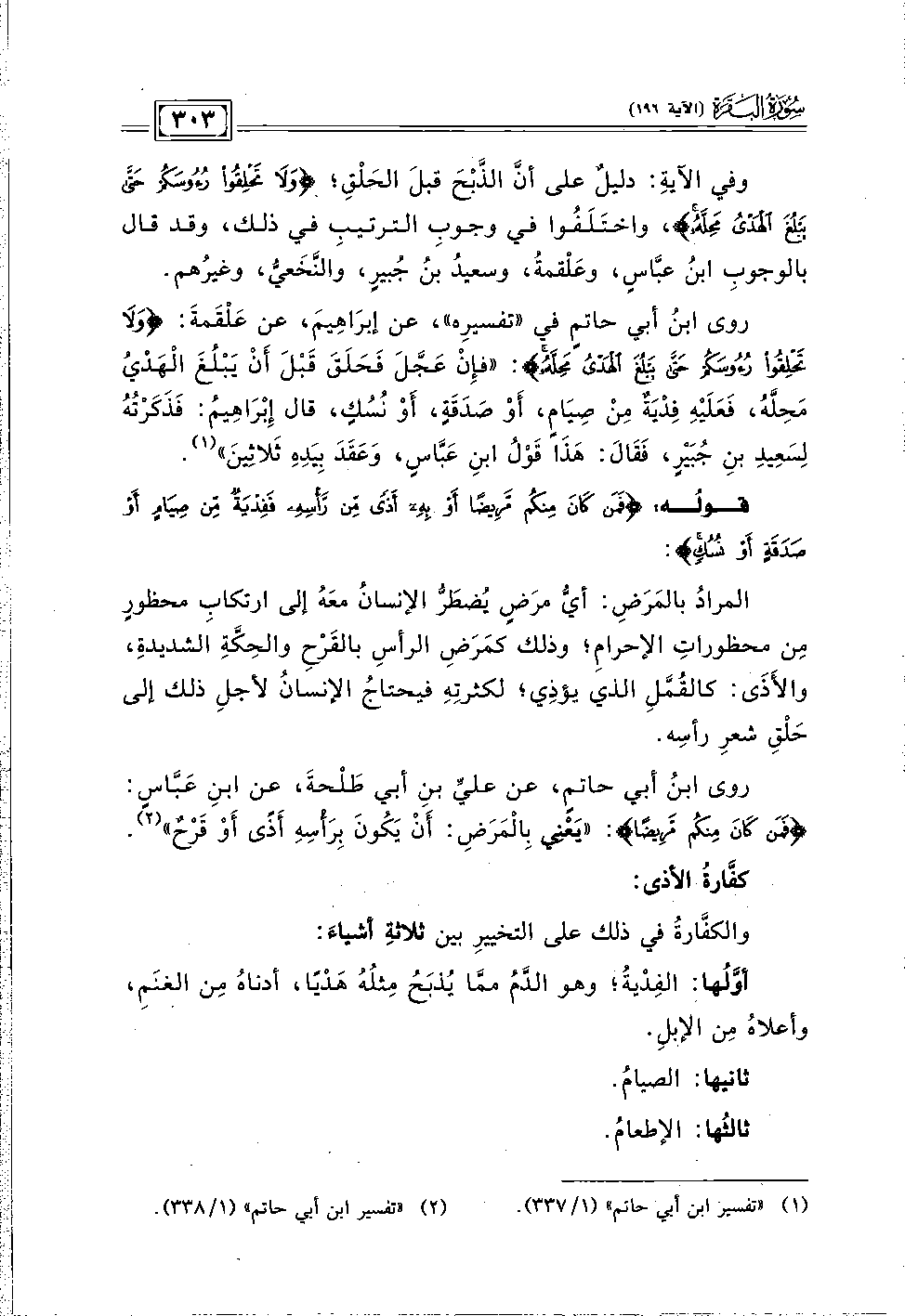 روى ابنُ أبي حاتمٍ في "تفسيرِه"، عن إبرَاهِيمَ، عن عَلْقَمةَ: {وَلَا تَحْلِقُوا رُءُوسَكُمْ حَتَّى يَبْلُغَ الْهَدْيُ مَحِلَّهُ}: "فإِنْ عَجَّلَ فَحَلَقَ قَبْلَ أَنْ يَبْلُغَ الْهَدْيُ مَحِلَّهُ، فَعَلَيْهِ فِدْيَةٌ مِنْ صِيَامٍ، أَوْ صَدَقَةٍ، أَوْ نُسُكٍ، قال إِبْرَاهِيمُ: فَذَكَرْتُهُ لِسَعِيدِ بنِ جُبَيْرٍ، فَفَالَ: هَذَا قَوْلُ ابنِ عَبَّاسٍ، وَعَقَدَ بِيَدِهِ ثَلاثِينَ" (١).