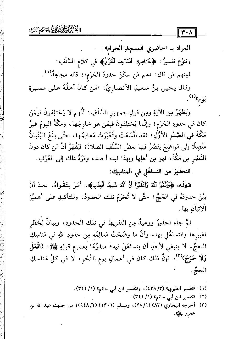 ويَظهَرُ مِن الآيةِ ومِن قولِ جمهورِ السَّلَفِ: أنَّهم لا يَختلِفونَ فيمَنْ كان في حدودِ الحَرَمِ؛ وإنَّما يَختلِفونَ فيمَن هو خارِجَها، ومكَّة اليومَ غيرُ مَكَّةَ في الصَّدْرِ الأوَّلِ؛ فقد اتَّسَعَتْ وتَغَيَّرَتْ مَعالِمُها، حتَّى بلَغَ البُنْيانُ متَّصِلًا إلى مَواضِعَ يقصُرُ فيها بعضُ السَّلَفِ الصلاةَ؛ فيَظْهَرُ أنَّ مَن كان دونَ القَصْرِ مِن مَكَّةَ، فهو مِن أهلِها وبهذا قيده أحمد، ومَرَدُّ ذلك إلى العُرْفِ.