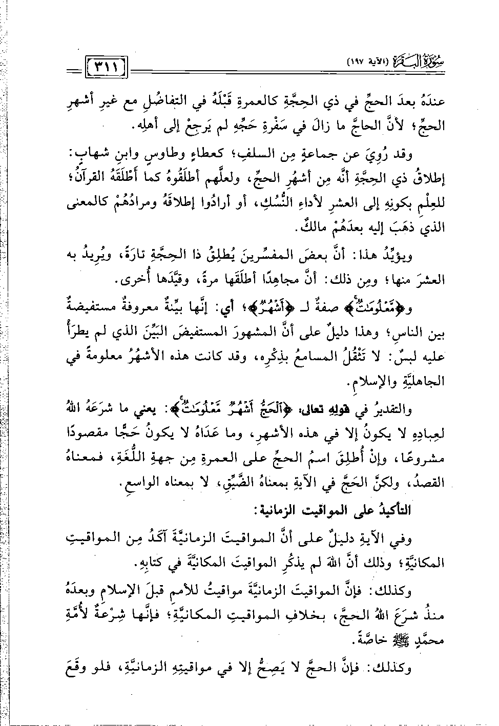 والتقديرُ في قولِهِ تعالى: {الْحَجُّ أَشْهُرٌ مَعْلُومَاتٌ}: يعني ما شرَعَهُ اللهُ لعِبادِهِ لا يكونُ إلا في هذه الأشهرِ، وما عَدَاهُ لا يكونُ حَجًّا مقصودًا مشروعًا، وإنْ أُطلِقَ اسمُ الحجِّ على العمرةِ مِن جهةِ اللُّغَةِ، فمعناهُ القصدُ، ولكنَّ الحَجَّ في الآيةِ بمعناهُ الضَّيِّقِ، لا بمعناه الواسعِ.