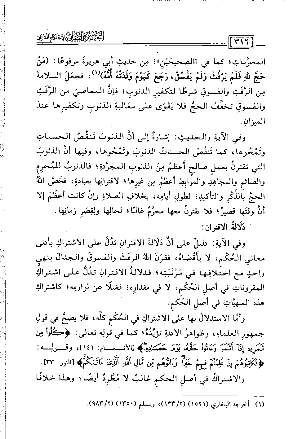 وفي الآيةِ: دليلٌ على أنَّ دَلَالةَ الاقترانِ تدُلُّ على الاشتراكِ بأدنى معاني الحُكْمِ، لا بأَقْصَاهُ، فقرَنَ اللهُ الرفَثَ والفسوقَ والجدالَ بنهيٍ واحدٍ مع اختلافِها في مَرْتَبَتِه؛ فدلالةُ الاقترانِ تدُلُّ على اشتراكِ المقروناتِ في أصلِ الحُكْمِ، لا في مقدارِه؛ فضلًا عن لوازمِه؛ كاشتراكِ هذه المنهيَّاتِ في أصلِ الحُكْمِ.