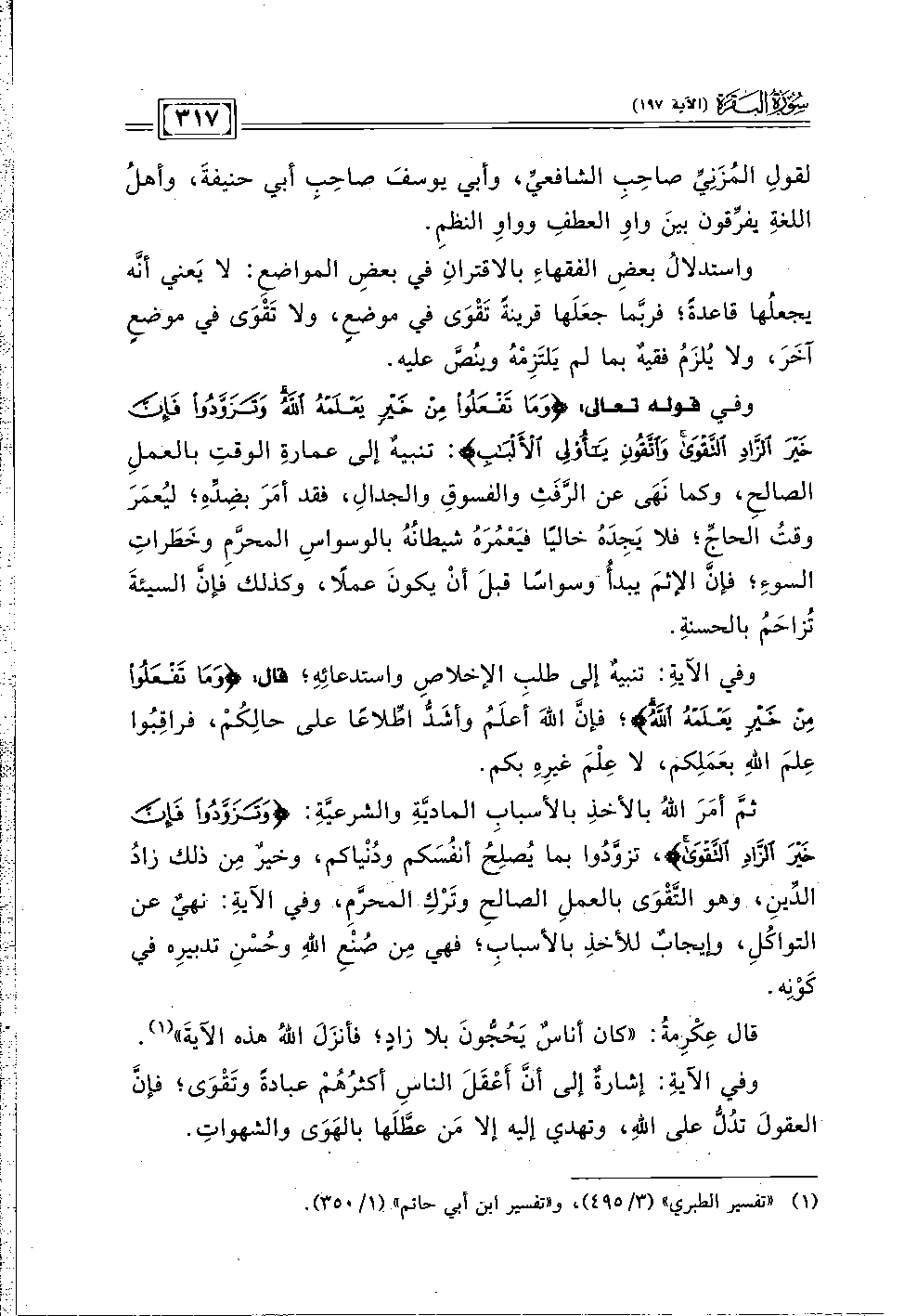 ثمَّ أمَرَ اللهُ بالأخذِ بالأسبابِ الماديَّةِ والشرعيَّةِ: {وَتَزَوَّدُوا فَإِنَّ خَيْرَ الزَّادِ التَّقْوَى}، تزوَّدُوا بما يُصلِحُ أنفُسَكم ودُنْياكم، وخيرٌ مِن ذلك زادُ الدِّينِ، وهو التَّقْوَى بالعملِ الصالحِ وتَرْكِ المحرَّمِ، وفي الآيةِ: نهيٌ عن التواكُلِ، وإيجابٌ للأخذِ بالأسبابِ؛ فهي مِن صُنْعِ الله وحُسْنِ تدبيرِه في كَوْنِه.