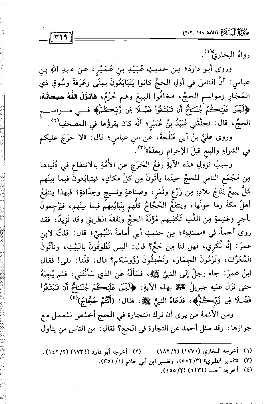 وروى أبو داودَ؛ مِن حديثِ عُبَيْدِ بنِ عُمَيْرٍ، عن عبدِ اللهِ بنِ عباسٍ: أنَّ الناسَ في أولِ الحجِّ كانوا يَتَبَايَعُونَ بمِنًى وعَرَفةَ وسُوقِ ذي المَجَازِ ومواسمِ الحجِّ، فخافُوا البيعَ وهم حُرُمٌ، فأنزَلَ اللهُ سبحانَهُ: {لَيْسَ عَلَيْكُمْ جُنَاحٌ أَنْ تَبْتَغُوا فَضْلًا مِنْ رَبِّكُمْ} في مواسمِ الحجِّ، قال: فحدَّثَني عُبَيْدُ بنُ عُمَيْرٍ؛ أنَّه كان يقرؤُها في المصحفِ (٢).