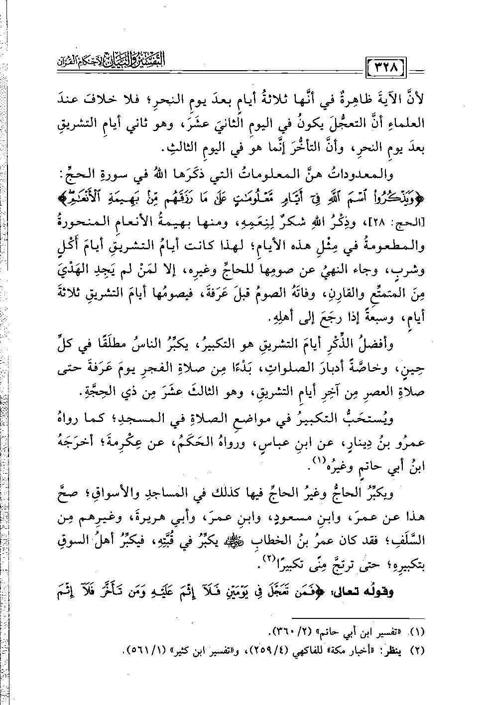 ويكبِّرُ الحاجُّ وغيرُ الحاجِّ فيها كذلك في المساجدِ والأسواقِ؛ صحَّ هذا عن عمرَ، وابنِ مسعودٍ، وابنِ عمرَ، وأبي هريرةَ، وغيرِهم مِن السَّلَفِ؛ فقد كان عمرُ بنُ الخطابِ - رضي الله عنه - يكبِّرُ في قُبَّتِهِ، فيكبِّرُ أهلُ السوقِ بتكبيرِهِ؛ حتى ترتجَّ مِنًى تكبيرًا (٢).