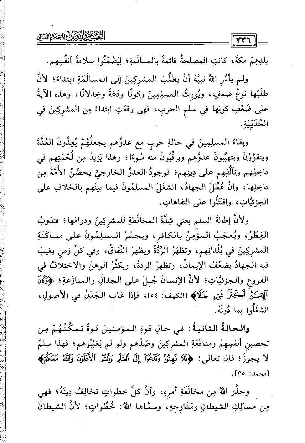 والحالةُ الثانيةُ: في حالِ قوةِ المؤمنينَ قوةً تمكِّنُهُمْ مِن تحصينِ أنفسِهِمْ ومدافَعَةِ المشرِكِينَ وصَدِّهم ولو لم يَغلِبُوهم؛ فهذا سلمٌ لا يجوزُ؛ قال تعالى: {فَلَا تَهِنُوا وَتَدْعُوا إِلَى السَّلْمِ وَأَنْتُمُ الْأَعْلَوْنَ وَاللَّهُ مَعَكُمْ} [محمد: ٣٥].