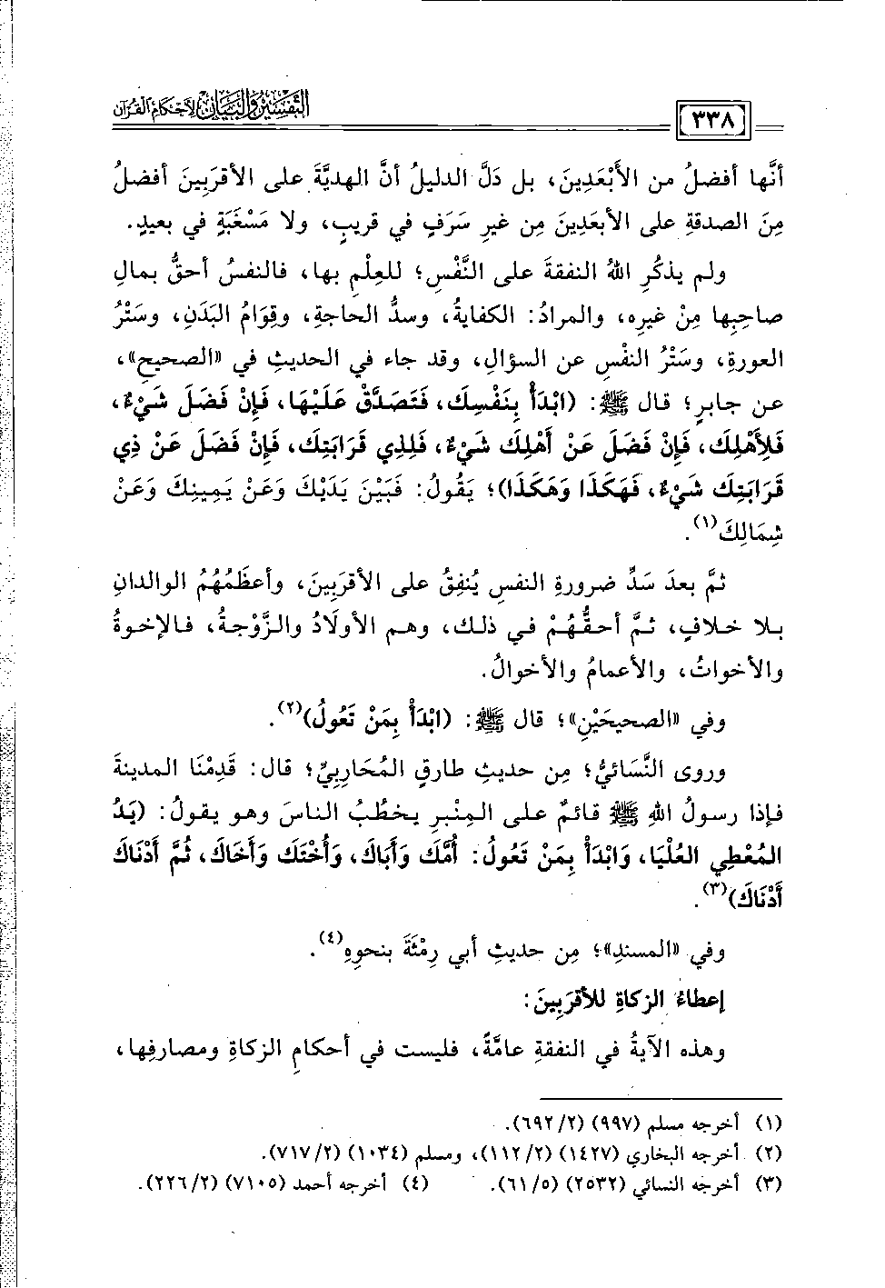 ولم يذكُرِ اللهُ النفقةَ على النَّفْسِ؛ للعِلْمِ بها، فالنفسُ أحقُّ بمالِ صاحِبِها مِنْ غيرِه، والمرادُ: الكفايةُ، وسدُّ الحاجةِ، وقِوَامُ البَدَنِ، وسَتْرُ العورةِ، وسَتْرُ النفْسِ عن السؤالِ، وقد جاء في الحديثِ في "الصحيحِ"، عن جابرٍ؛ قال - صلى الله عليه وسلم -: (ابْدَأْ بنَفْسِكَ، فَتَصَدَّقْ عَلَيْهَا، فَإِنْ فَضَلَ شَيْءٌ، فَلِأَهْلِكَ، فَإِنْ فَضَلَ عَنْ أَهْلِكَ شَيْءٌ، فَلِذِي قَرَابَتِكَ، فَإِنْ فَضَلَ عَنْ ذِي قَرَابَتِكَ شَيْءٌ، فَهَكَذَا وَهَكَذَا)؛ يَقُولُ: فَبَيْنَ يَدَيْكَ وَعَنْ يَمِينِكَ وَعَنْ شِمَالِكَ (١).