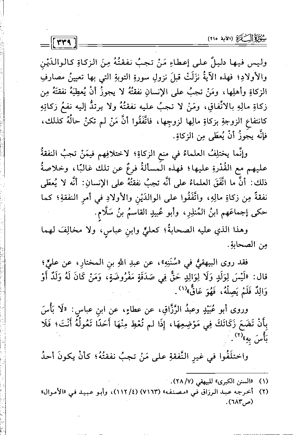 وليس فيها دليلٌ على إعطاءِ مَنْ تجبُ نفقتُهُ مِنَ الزكاةِ كالوالدَيْنِ والأولادِ؛ فهذه الآيةُ نزلَتْ فيَ نزولِ سورةِ التوبةِ التي بها تعيينُ مصارفِ الزكاةِ وأهلِها، ومَنْ تجبُ على الإنسانِ نفقتُهُ لا يجوزُ أن يُعطِيَهُ نفقتَهُ مِن زكاةِ مالِهِ بالانِّفاقِ، ومَنْ لا تجبُ عليه نفقتُهُ ولا يرتدُّ إليه نفعُ زكاتِهِ كانتفاعِ الزوجةِ بزكاةِ مالِها لزوجِها، فاتَّفَقُوا أنَّ مَنْ لم تكنْ حالُهُ كذلك، فإنَّه يجوزُ أنْ يُعطَى مِن الزكاةِ.