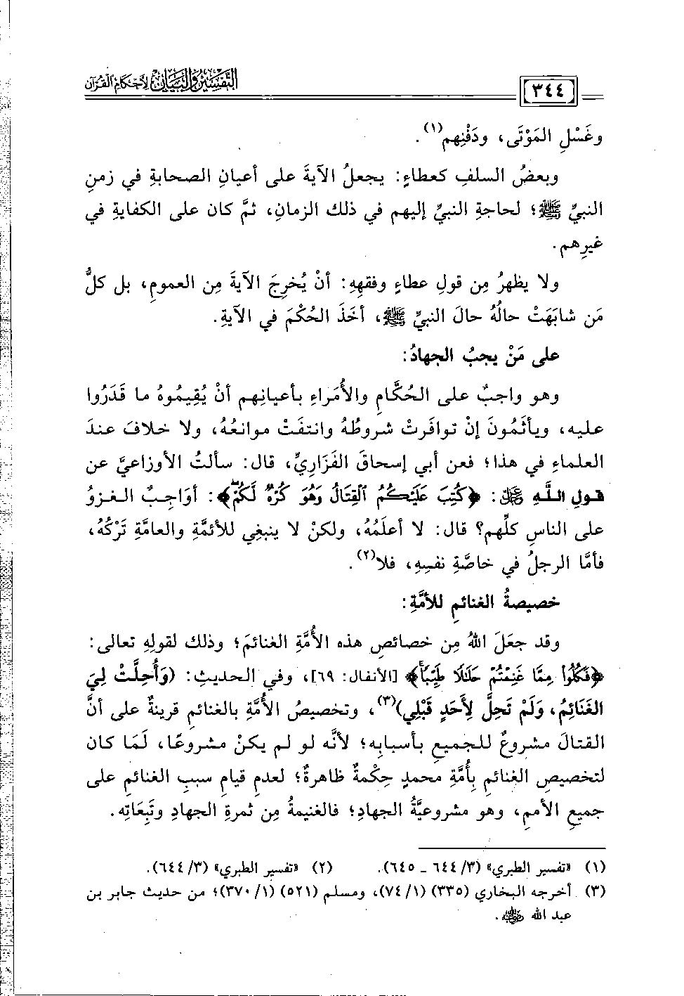 وقد جعَلَ اللهُ مِن خصائصِ هذه الأُمَّةِ الغنائمَ؛ وذلك لقولِهِ تعالى: {فَكُلُوا مِمَّا غَنِمْتُمْ حَلَالًا طَيِّبًا} [الأنفال: ٦٩]، وفي الحديثِ: (وَأُحِلَّتْ لِيَ الغَنَائِمُ، وَلَمْ تَحِلَّ لِأَحَدٍ قَبْلِي) (٣)، وتخصيصُ الأُمَّةِ بالغنائمِ قرينةٌ على أنَّ القتالَ مشروعٌ للجميعِ بأسبابِه؛ لأنَّه لو لم يكنْ مشروعًا، لَمَا كان لتخصيصِ الغنائمِ بأُمَّةِ محمدٍ حِكْمةٌ ظاهرةٌ، لعدمِ قيامِ سببِ الغنائمِ على جميعِ الأممِ، وهو مشروعيَّةُ الجهادِ؛ فالغنيمةُ مِن ثمرةِ الجهادِ وتَبِعَاتِه.