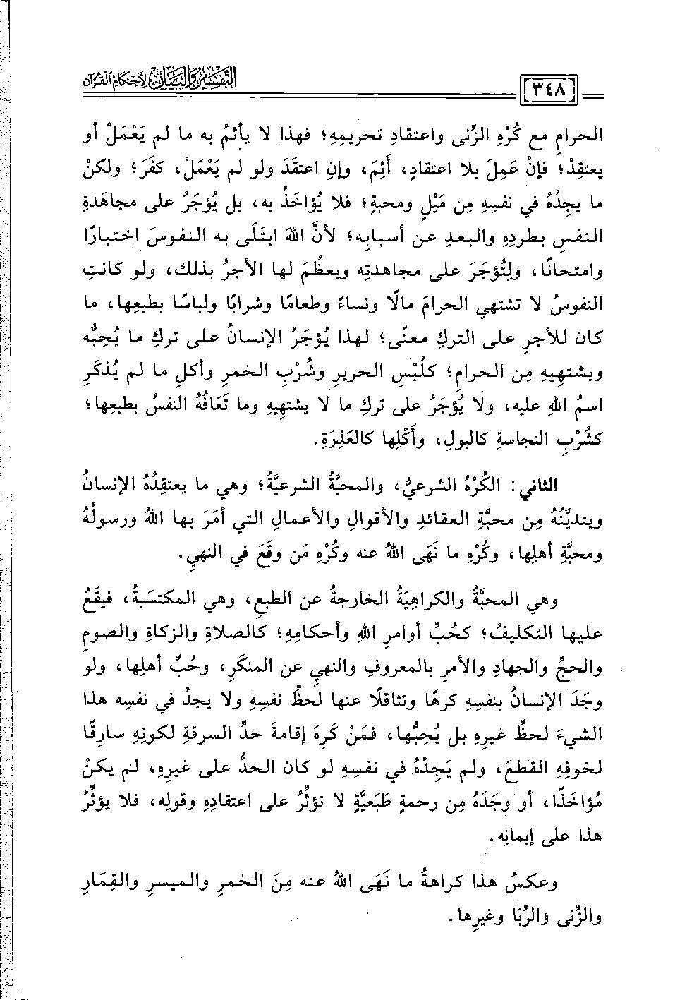 الحرامِ مع كُرْهِ الزِّنى واعتقادِ تحريمِهِ؛ فهذا لا يأثمُ به ما لم يَعْمَل أو يعتقِدْ؛ فإن عَمِلَ بلا اعتقادٍ، أَثِمَ، وإنِ اعتقَدَ ولو لم يَعْمَلْ، كفَرَ؛ ولكنْ ما يجِدُهُ في نفسِهِ مِن مَيْلٍ ومحبةٍ؛ فلا يُؤاخَذُ به، بل يُؤجَرُ عَلَى مجاهَدةِ النفسِ بطردِهِ والبعدِ عن أسبابِه؛ لأنَّ اللهَ ابتَلَى له النفوسَ اختبارًا وامتحانًا، ولِتُؤجَرَ عَلَى محاهدتِه ويعظُمَ لها الأجرُ بذلك، ولو كانتِ النفوسُ لا تشتهي الحرامَ مالًا ونساءً وطعامًا وشرابًا ولباسًا بطبعِها، ما كان للأجرِ على التركِ معنًى؛ لهذا يُؤجَرُ الإنسانُ على تركِ ما يُحِبُّه ويشتهِيهِ مِن الحرامِ؛ كلُبْسِ الحريرِ وشُرْبِ الخمرِ وأكلِ ما لم يُذكَرِ اسمُ اللهِ عليه، ولا يُؤجَرُ عَلَى تركِ ما لا يشتهِيهِ وما تَعَافُهُ النفسُ بطبعِها؛ كشُرْبِ النجاسةِ كالبولِ، وأَكْلِها كالعَذِرَةِ.