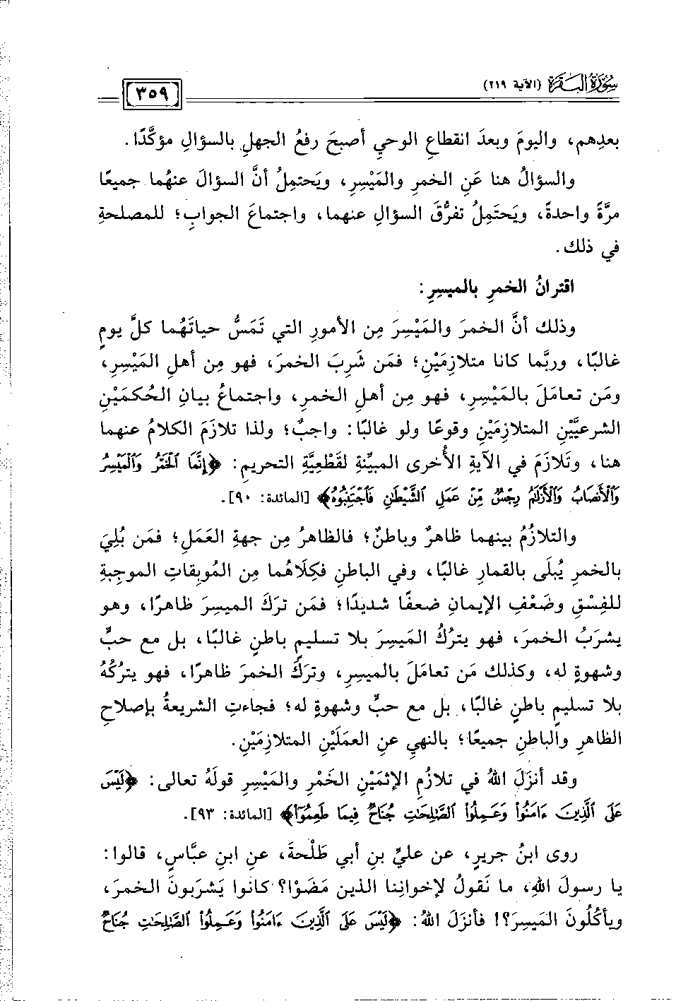وذلك أنَّ الخمرَ والمَيْسِرَ مِن الأمورِ التي تَمَسُّ حياتَهُما كلَّ يومٍ غالبًا، وربَّما كانا متلازِمَيْنِ؛ فمَن شَرِبَ الخمرَ، فهو مِن أهلِ المَيْسِرِ، ومَن تعامَلَ بالمَيْسِرِ، فهو مِن أهلِ الخمرِ، واجتماعُ بيانِ الحُكمَيْنِ الشرعيَّيْنِ المتلازِمَيْنِ وقوعًا ولو غالبًا: واجبٌ؛ ولذا تلازَمَ الكلامُ عنهما هنا، وتَلازَمَ في الآيةِ الأُخرى المبيِّنةِ لقَطْعِيَّةِ التحريمِ: {إِنَّمَا الْخَمْرُ وَالْمَيْسِرُ وَالْأَنْصَابُ وَالْأَزْلَامُ رِجْسٌ مِنْ عَمَلِ الشَّيْطَانِ فَاجْتَنِبُوهُ لَعَلَّكُمْ تُفْلِحُونَ} [المائدة: ٩٠].