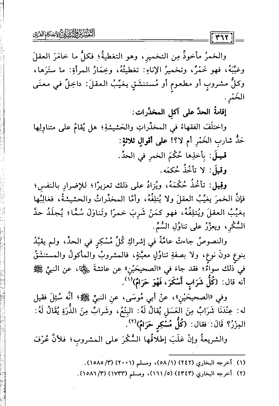 واختلَفَ الفقهاءُ في المخدِّراتِ والحَشيشةِ؛ هل يُقامُ على متناوِلها حَدُّ شاربِ الخَمْرِ أم لا؟ ! على أقوالٍ ثلاثةٍ: