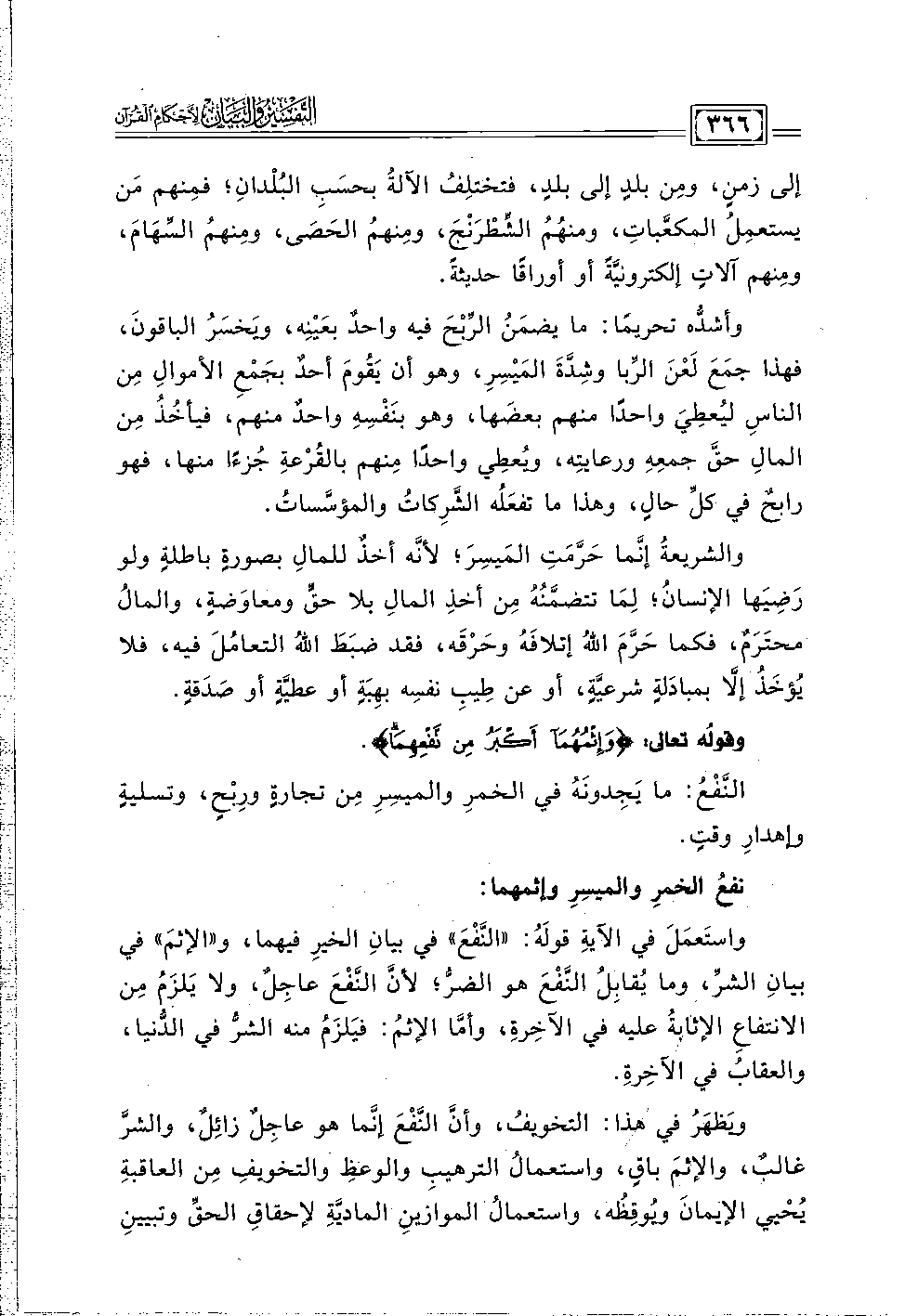 واستَعمَلَ في الآيةِ قولَهُ: "النَّفْعَ" في بيانِ الخيرِ فيهما، و"الإثمَ" في بيانِ الشرِّ، وما يُقابِلُ النَّفْعَ هو الضرُّ؛ لأنَّ النَّفْعَ عاجِلٌ، ولا يَلزَمُ مِن الانتفاعِ الإثابةُ عليه في الآخِرةِ، وأمَّا الإثمُ: فيَلزَمُ منه الشرُّ في الدُّنيا، والعقابُ في الآخِرةِ.