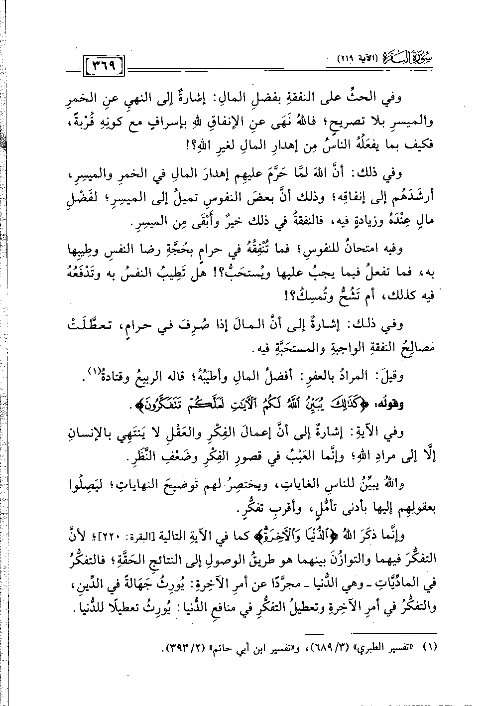 وفي الحثِّ على النفقةِ بفضلِ المالِ: إشارةٌ إلى النهيِ عنِ الخمرِ والميسرِ بلا تصريحٍ؛ فاللهُ نَهَى عنِ الإنفاقِ للهِ بإسرافٍ مع كونِهِ قُرْبةً، فكيف بما يفعَلُهُ الناسُ مِن إهدارِ المالِ لغيرِ اللهِ؟ !