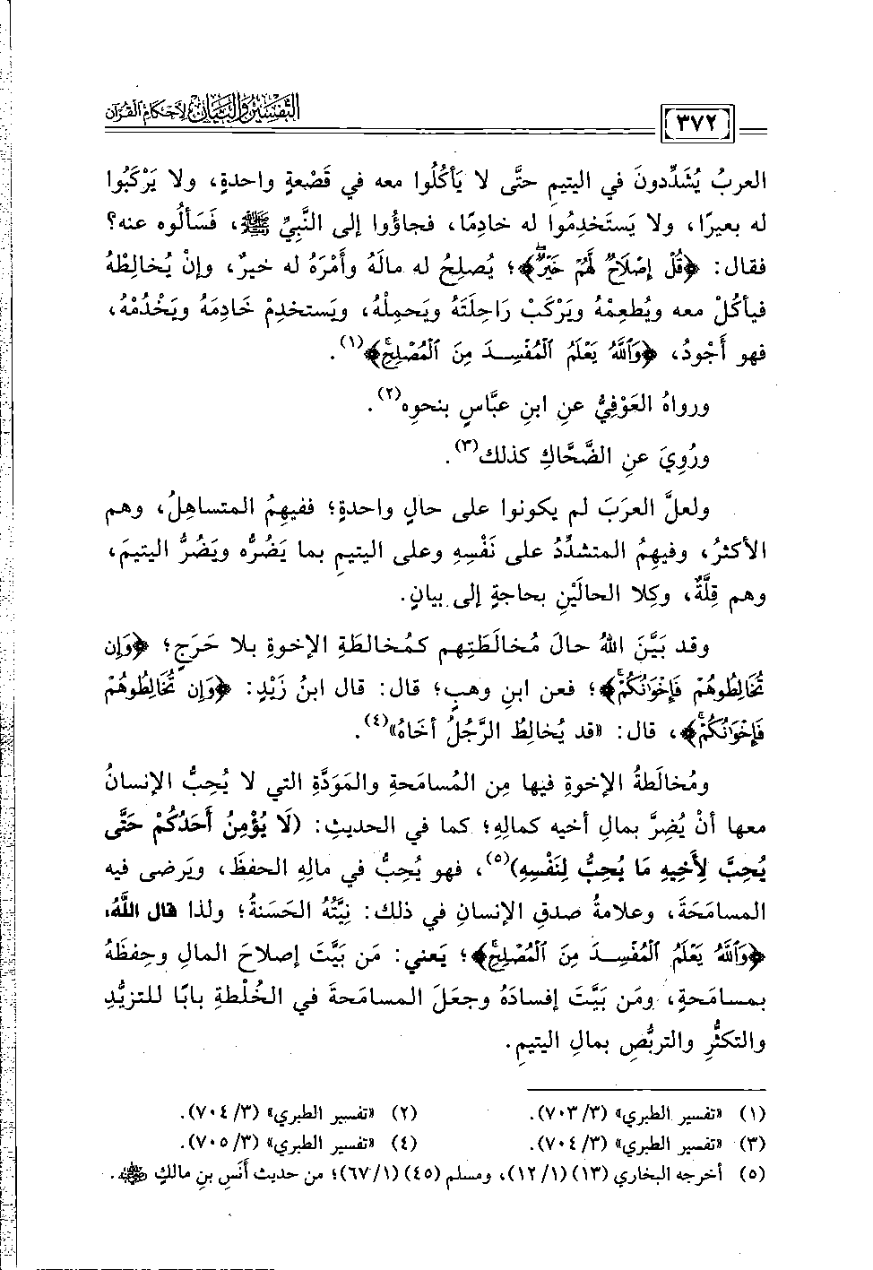 ومُخالَطةُ الإخوةِ فيها مِن المُسامَحةِ والمَوَدَّةِ التي لا يُحِبُّ الإنسانُ معها أنْ يُضِرَّ بمالِ أخيه كمالِهِ؛ كما في الحديث: (لَا يُؤْمِنُ أحَدُكُمْ حَتَّى يُحِبَّ لِأَخِيهِ مَا يُحِبُّ لِنَفْسِهِ) (٥)، فهو يُحِبُّ في مالِهِ الحفظَ، ويَرضى فيه المسامَحَةَ، وعلامةُ صدقِ الإنسانِ في ذلك: نِيَّتُهُ الحَسَنةُ؛ ولذا قال اللهُ: {وَاللَّهُ يَعْلَمُ الْمُفْسِدَ مِنَ الْمُصْلِحِ}؛ يَعني: مَن بَيَّتَ إصلاحَ المالِ وحِفظَهُ بمسامَحةٍ، ومَن بَيَّتَ إفسادَه وجعَلَ المسامَحةَ في الخُلْطةِ بابًا للتزيُّدِ والتكثُّرِ والتربُّصِ بمالِ اليتيمِ.