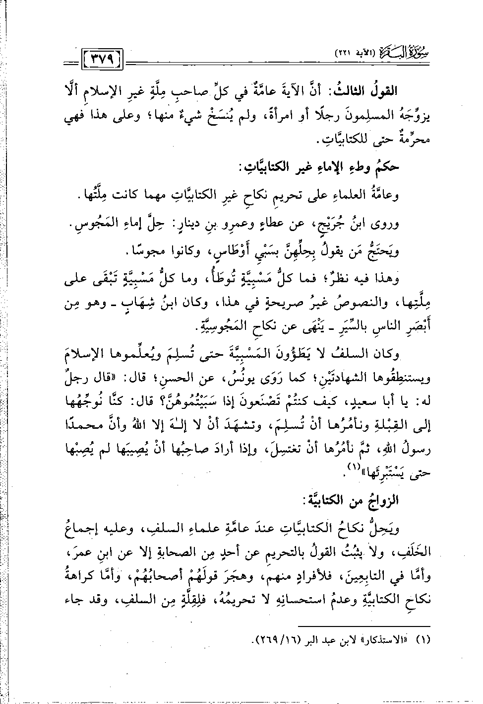 ويَحِلُّ نكاحُ الكتابيَّاتِ عندَ عامَّةِ علماءِ السلفِ، وعليه إجماعُ الخَلَفِ، ولا يثبُتُ القولُ بالتحريمِ عن أحدٍ مِن الصحابةِ إلا عن ابنِ عمرَ، وأمَّا في التابِعِينَ، فلأفرادٍ منهم، وهجَرَ قولَهُمْ أصحابُهُمْ، وأمَّا كراهةُ نكاحِ الكتابيَّةِ وعدمُ استحسانِهِ لا تحريمُهُ، فلِقِلَّةٍ مِن السلفِ، وقد جاء
