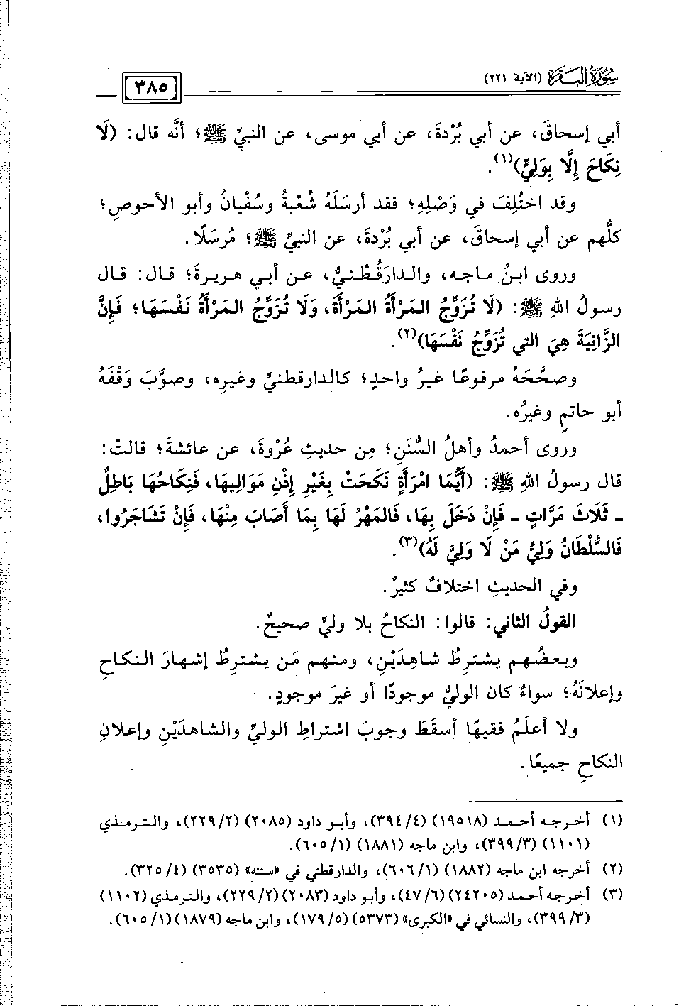 وروى أحمدُ وأهلُ السُّنَنِ؛ مِن حديثِ عُرْوةَ، عن عائشةَ؛ قالتْ: قال رسولُ اللهِ - صلى الله عليه وسلم -: (أَيُّمَا امْرَأَةٍ نَكَحَتْ بِغَيْرِ إِذْنِ مَوَالِيهَا، فَنِكَاحُهَا بَاطِلٌ - ثَلَاثَ مَرَّاتٍ - فَإِنْ دَخَلَ بِهَا، فَالمَهْرُ لَهَا بِمَا أَصَابَ مِنْهَا، فَإِنْ تَشَاجَرُوا، فَالسُّلْطَانُ وَلِيُّ مَنْ لَا وَلِيَّ لَهُ) (٣).