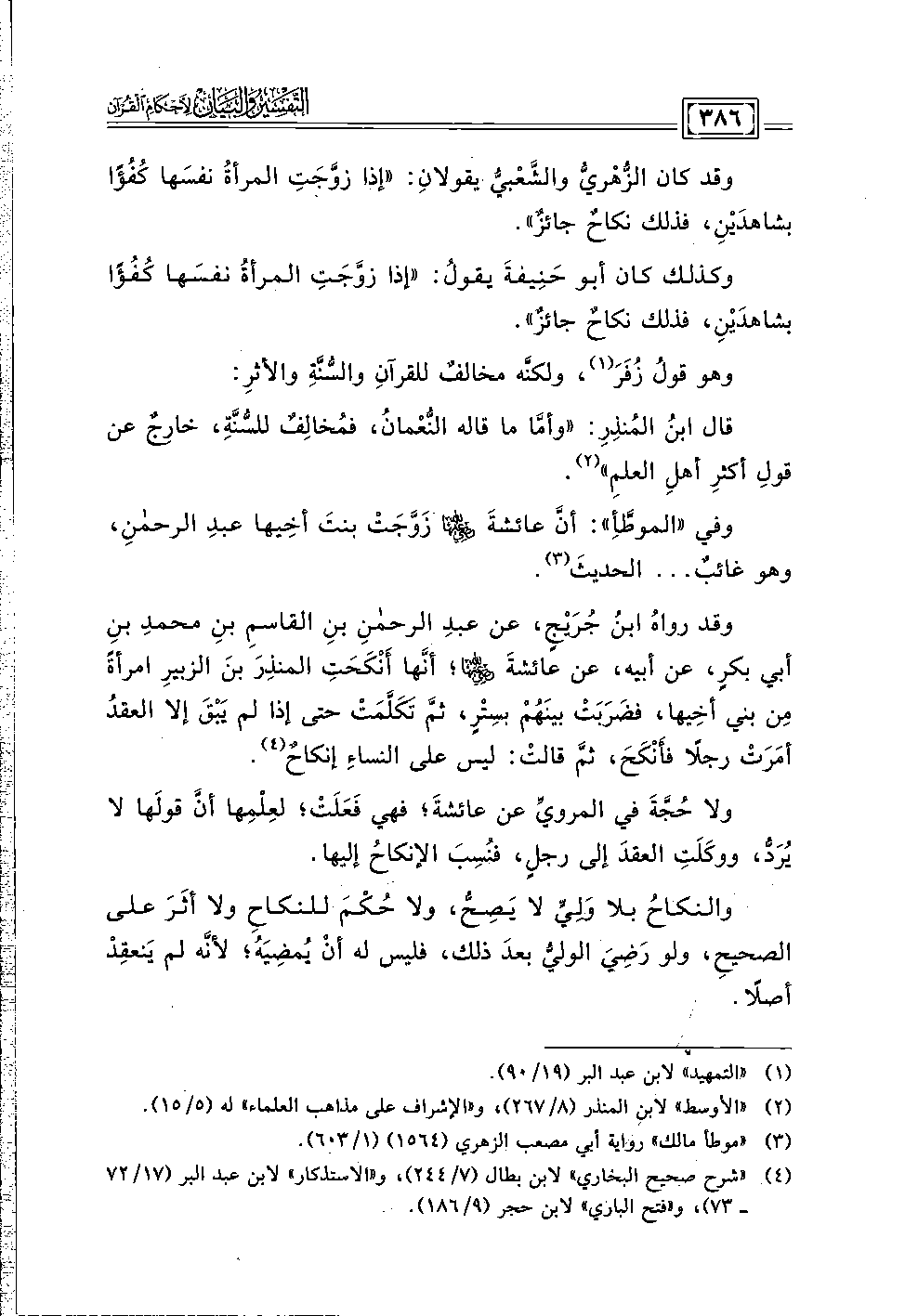 وقد رواهُ ابن جُرَيْجٍ، عن عبدِ الرحمنِ بنِ القاسمِ بنِ محمدِ بنِ أبي بكرٍ، عن أبيه، عن عائشةَ - رضي الله عنها -؛ أنَّها أَنْكَحَتِ المنذِرَ بنَ الزبيرِ امرأةً مِن بني أخِيها، فضَرَبَتْ بينَهُمْ بسِتْرٍ، ثمَّ تَكَلَّمَتْ حتى إذا لم يَبْقَ إلا العقدُ أمَرَتْ رجلًا فأَنْكَحَ، ثمَّ قالتْ: ليس على النساءِ إنكاحٌ (٤).