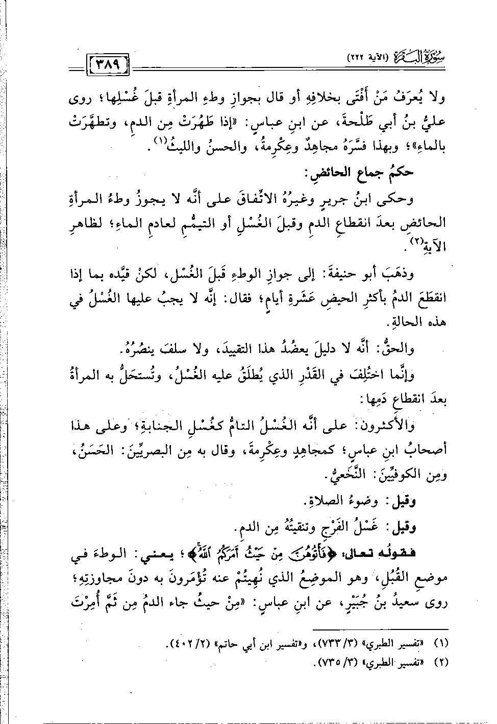 وحكى ابنُ جريرٍ وغيرُهُ الاتِّفاقَ على أنَّه لا يجوزُ وطءُ المرأةِ الحائضِ بعدَ انقطاعِ الدمِ وقبلَ الغُسْلِ أو التيمُّمِ لعادمِ الماءِ؛ لظاهرِ الآيةِ (٢).