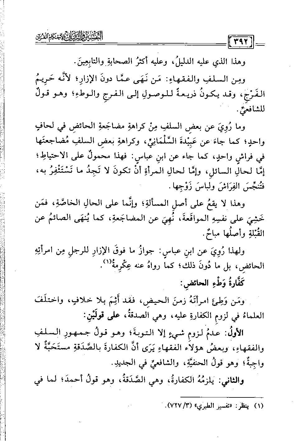 ومَن وَطِئَ امرأتَهُ زمنَ الحيضِ، فقد أَثِمَ بلا خلافٍ، واختلَفَ العلماءُ في لزومِ الكفارةِ عليه، وهي الصدقةُ، على قولَيْنِ: