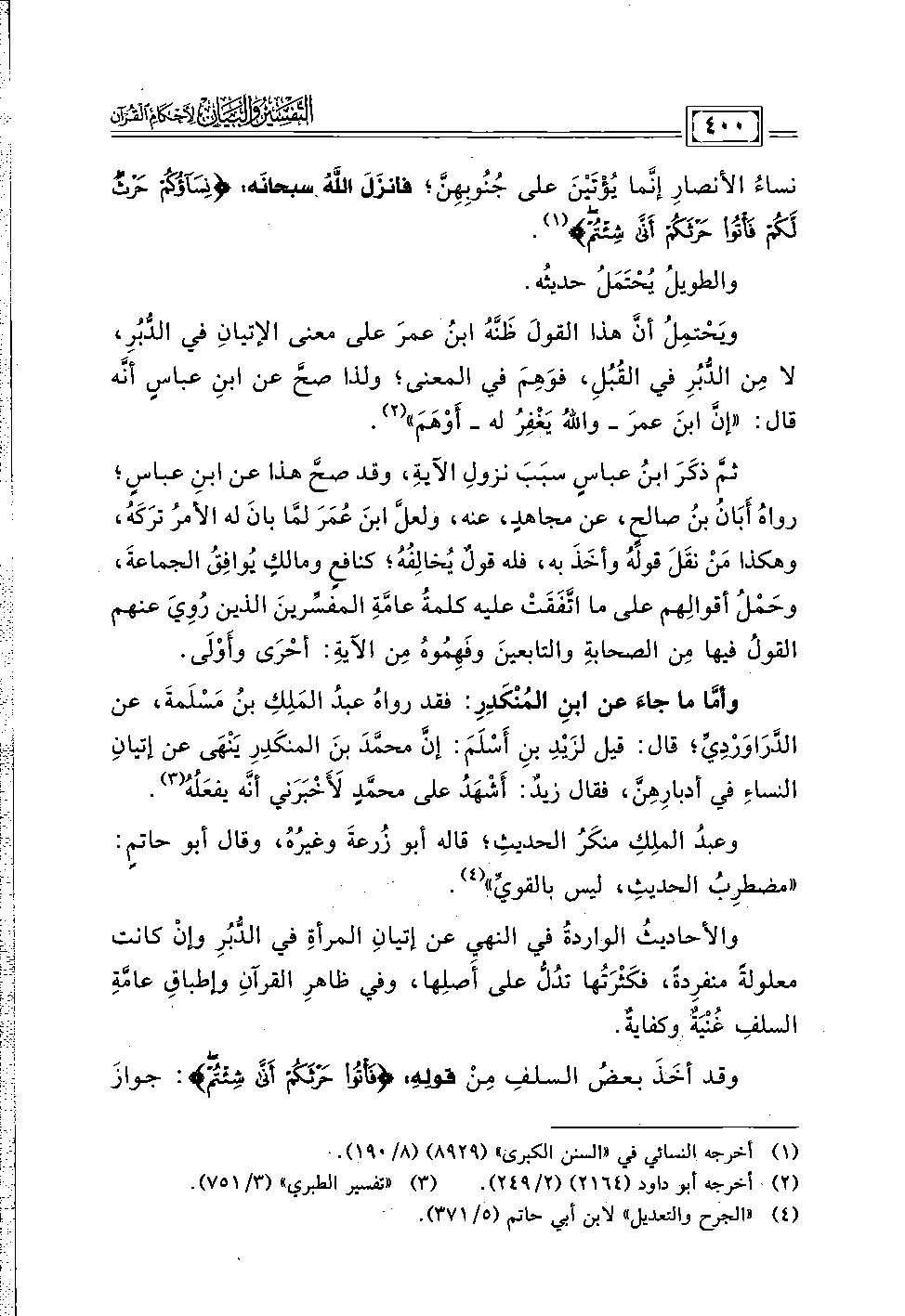 والأحاديثُ الواردةُ في النهي عن إتيانِ المرأةِ في الدُّبُرِ وإنْ كانت معلولةً منفرِدةً، فكَثْرَتُها تدُلُّ على أَصلِها، وفي ظاهرِ القرآنِ وإطباقِ عامَّةِ السلفِ غُنْيَةٌ وكفايةُ.