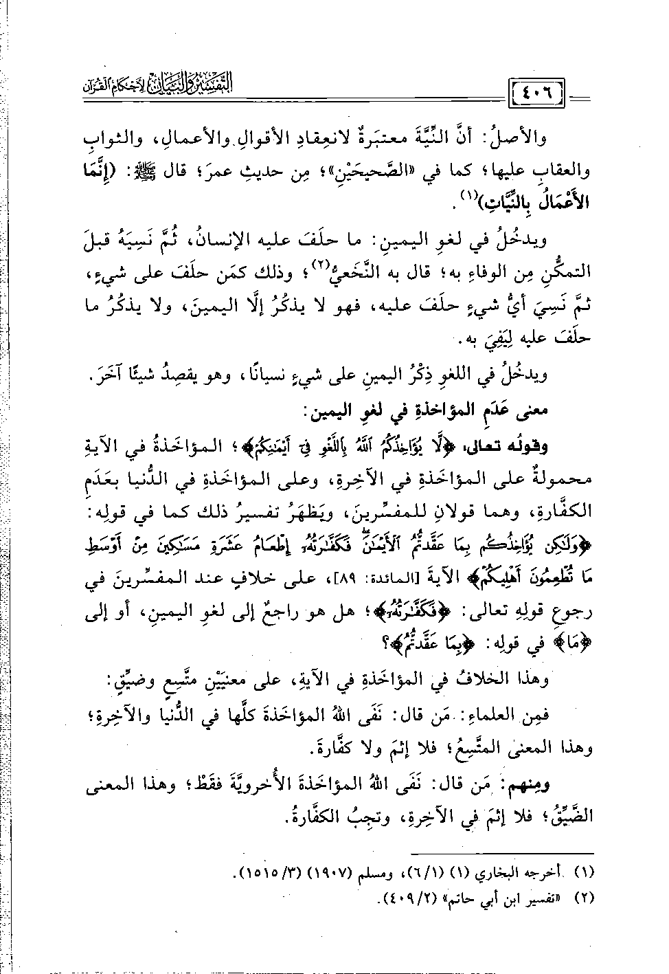 وقولُه تعالى: {لَا يُؤَاخِذُكُمُ اللَّهُ بِاللَّغْوِ فِي أَيْمَانِكُمْ}؛ المؤاخَذةُ في الآيةِ محمولةٌ على المؤاخَذةِ في الآخِرةِ، وعلى المؤاخَذةِ في الدُّنيا بعَدَمِ الكفَّارةِ، وهما قولانِ للمفسِّرينَ، ويَظهَرُ تفسيرُ ذلك كما في قولِه: {وَلَكِنْ يُؤَاخِذُكُمْ بِمَا عَقَّدْتُمُ الْأَيْمَانَ فَكَفَّارَتُهُ إِطْعَامُ عَشَرَةِ مَسَاكِينَ مِنْ أَوْسَطِ مَا تُطْعِمُونَ أَهْلِيكُمْ} الآيةَ [المائدة: ٨٩]، على خلافٍ عند المفسِّرينَ في رجوعِ قولِهِ تعالى: {فَكَفَّارَتُهُ}؛ هل هو راجعٌ إلى لغوِ اليمينِ، أو إلى {مَا} في قولِه: {بِمَا عَقَّدْتُمُ}؟