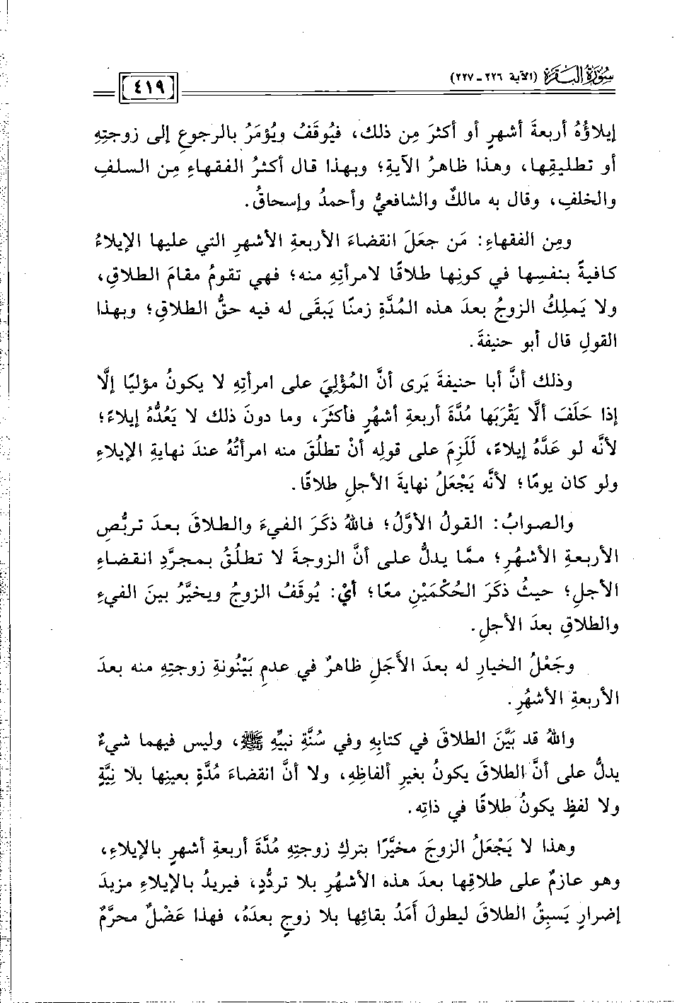 والصوابُ: القولُ الأوَّلُ؛ فاللهُ ذكَرَ الفيءَ والطلاقَ بعدَ تربُّصِ الأربعةِ الأشهُرِ؛ ممَّا يدلُّ على أنَّ الزوجةَ لا تطلُقُ بمجرَّدِ انقضاءِ الأجلِ؛ حيث ذكَرَ الحُكْمَيْنِ معًا؛ أيْ: يُوقَفُ الزوجُ ويخيَّرُ بينَ الفيءِ والطلاقِ بعدَ الأجلِ.