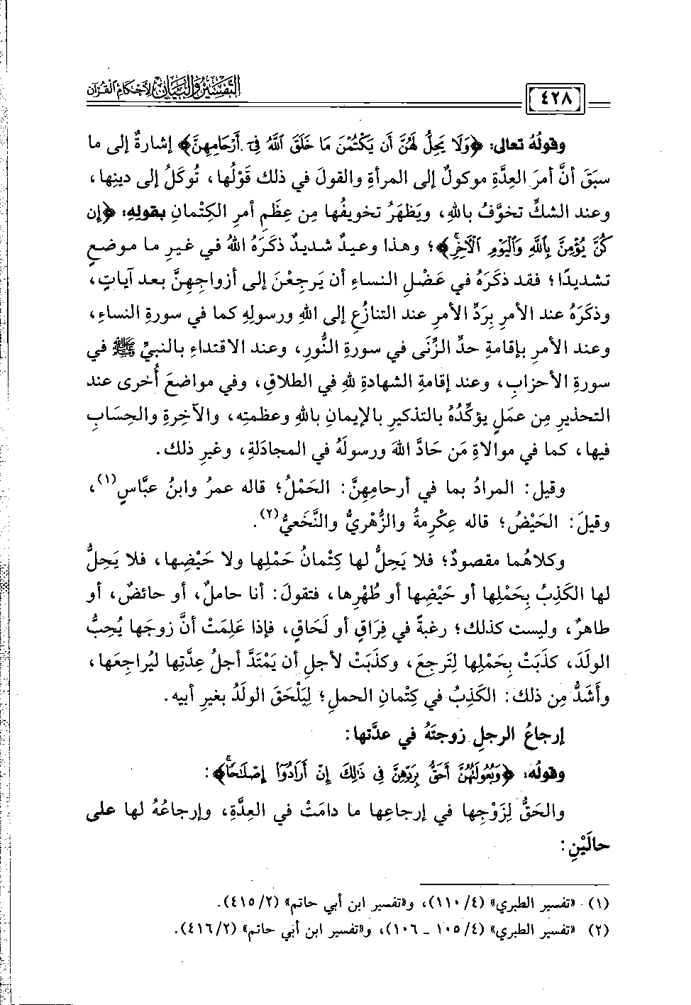 وقولُهُ تعالى: {وَلَا يَحِلُّ لَهُنَّ أَنْ يَكْتُمْنَ مَا خَلَقَ اللَّهُ فِي أَرْحَامِهِنَّ} إشارةٌ إلى ما سبَقَ أنَّ أمرَ العِدَّةِ موكولٌ إلى المرأةِ والقولَ في ذلك قَوْلُها، تُوكَلُ إلى دينِها، وعند الشكِّ تخوَّفُ باللهِ، ويَظهَرُ تخويفُها مِن عِظَمِ أمرِ الكِتْمانِ بقولِهِ: {إِنْ كُنَّ يُؤْمِنَّ بِاللَّهِ وَالْيَوْمِ الْآخِرِ}؛ وهذا وعيدٌ شديدٌ ذكَرَهُ اللهُ في غيرِ ما موضعٍ تشديدًا؛ فقد ذكَرَهُ في عَضْلِ النساءِ أن يَرجِعْنَ إلى أزواجِهِنَّ بعد آياتٍ، وذكَرَهُ عند الأمرِ بِرَدِّ الأمرِ عند التنازُعِ إلى اللهِ ورسولِهِ كما في سورةِ النساءِ، وعند الأمرِ بإقامةِ حدِّ الزِّنَى في سورةِ النُّورِ، وعند الاقتداءِ بالنبيِّ - صلى الله عليه وسلم - في سورةِ الأحزابِ، وعند إقامةِ الشهادةِ للهِ في الطلاقِ، وفي مواضعَ أُخرى عند التحذيرِ مِن عمَلٍ يؤكِّدُهُ بالتذكيرِ بالإيمانِ باللهِ وعظمتِه، والآخِرةِ والحِسَابِ فيها، كما في موالاةِ مَن حَادَّ اللهَ ورسولَهُ في المجادَلةِ، وغيرِ ذلك.