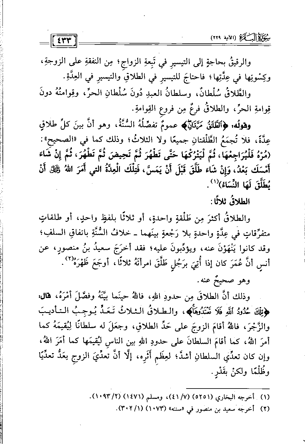 وقولُه: {الطَّلَاقُ مَرَّتَانِ} عمومٌ تفصِّلُهُ السُّنَّةُ، وهو أنَّ بينَ كلِّ طلاقٍ عِدَّةً، فلا تُجمَعُ الطَّلْقتانِ جميعًا ولا الثلاثُ؛ وذلك كما في "الصحيحِ": (مُرْهُ فَلْيُرَاجِعْهَا، ثُمَّ لْيَتْرُكْهَا حَتَّى تَطْهُرَ ثُمَّ تَحِيضَ ثُمَّ تَطْهُرَ، ثُمَّ إِنْ شَاءَ أَمْسَكَ بَعْدُ، وَإِنْ شَاءَ طَلَّقَ قَبْلَ أَنْ يَمَسَّ، فَتِلْكَ الْعِدَّةُ التي أَمَرَ اللهُ - عز وجل - أَنْ يُطَلَّقَ لَهَا النِّسَاءُ) (١).